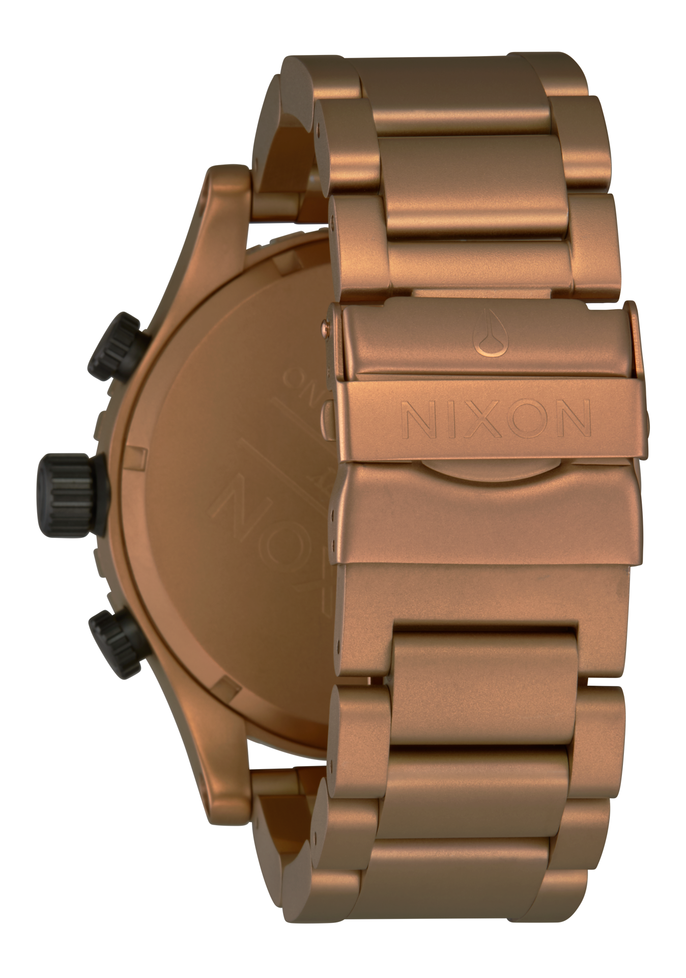 The crown on the Nixon 51-30 Chrono is located at the 9 o'clock position to prevent wrist bite when worn on the left hand, providing greater comfort during active use. This design choice allows the watch to be worn without the crown digging into the wrist, which is great if you're getting your hands dirty.