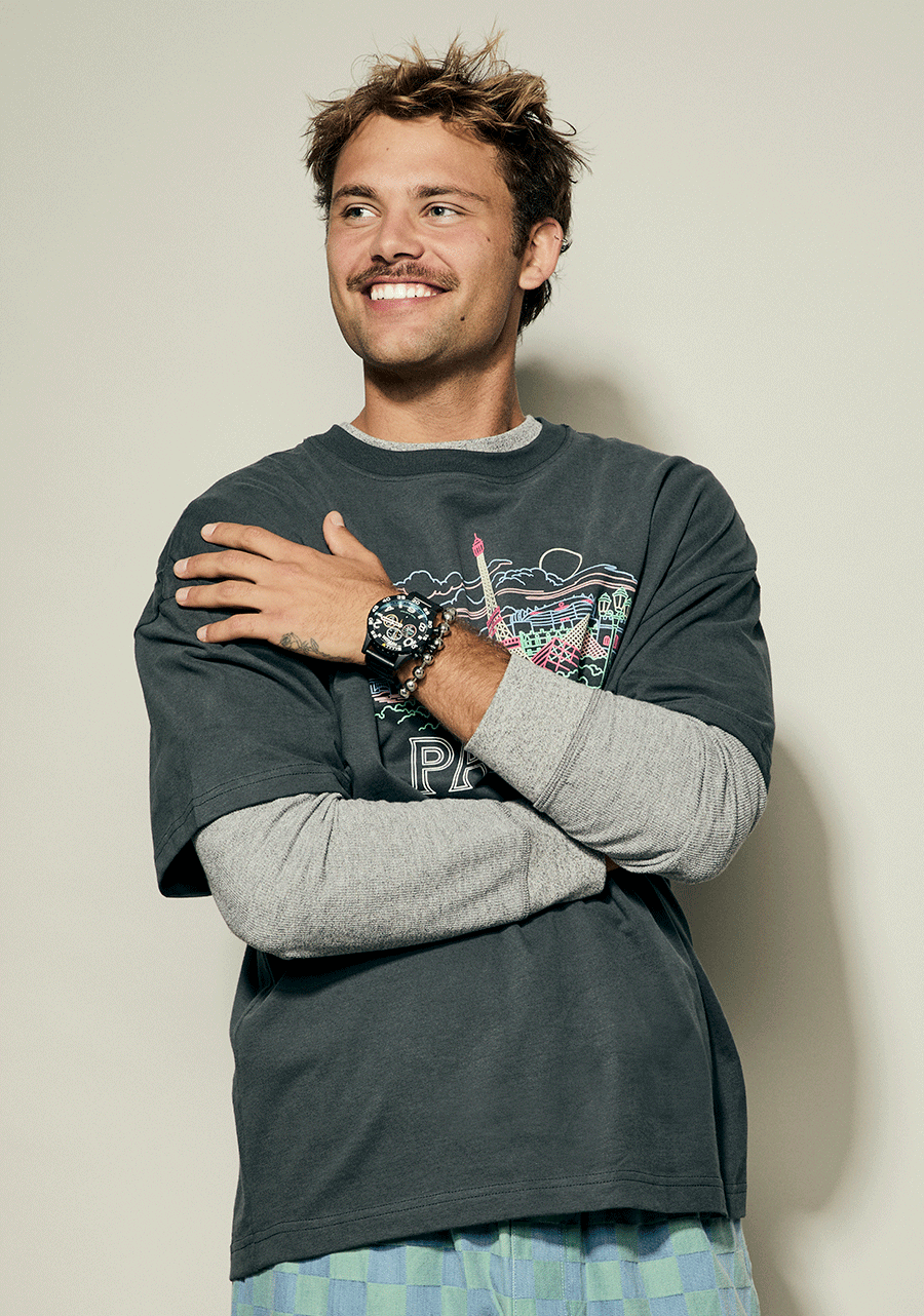 Nixon team rider Zach Miller wearing a watch from the Fisheye Collection while skateboarding.