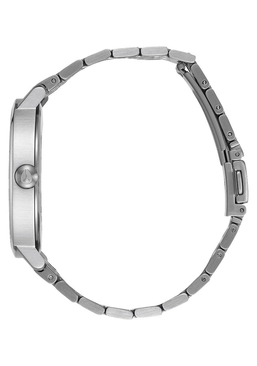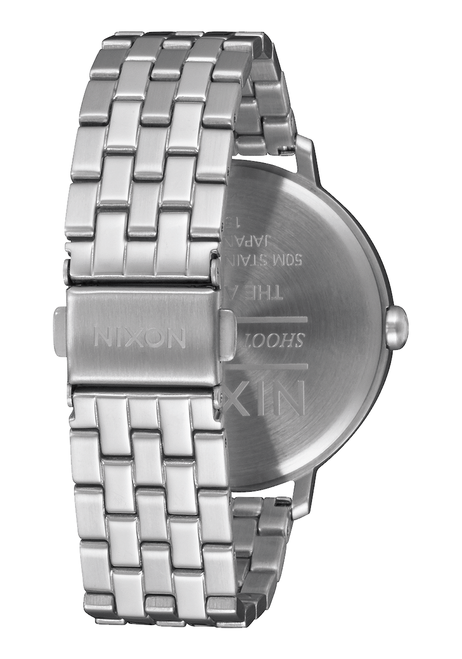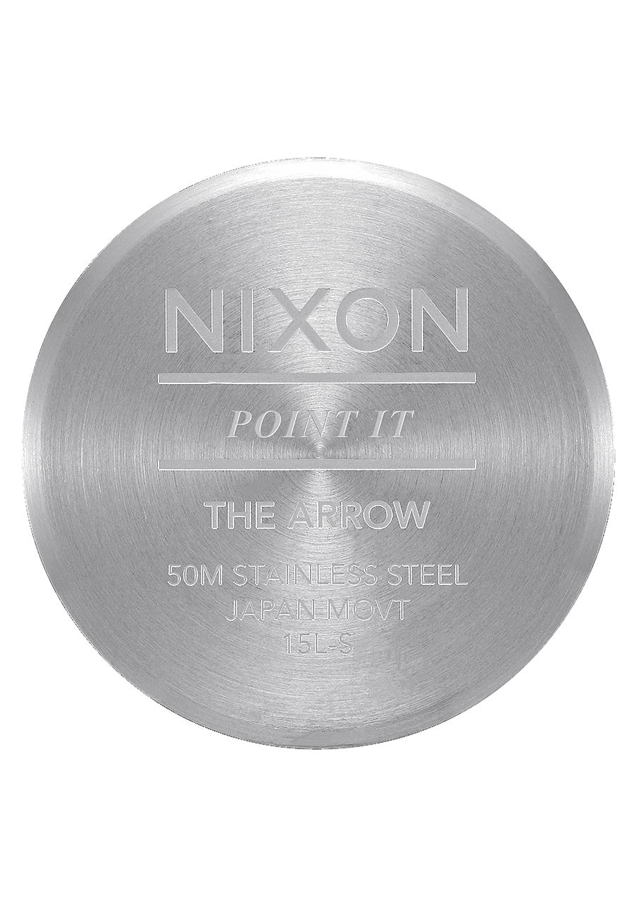 Dial features applied Nixon wordmark and hour markers in Arabic and stick format. Also features printed numbers and custom molded hands.