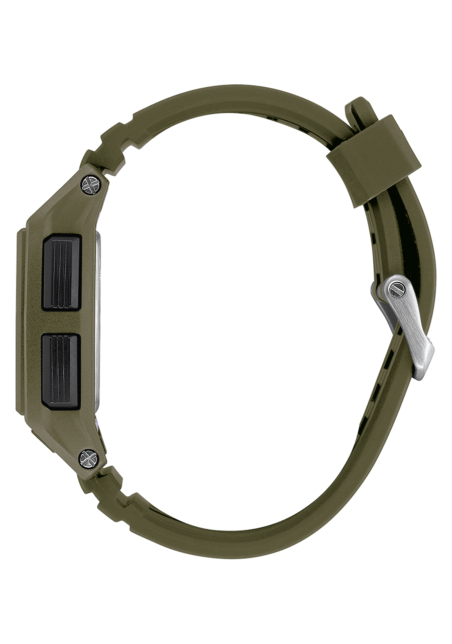 42mm custom reinforced recycled ocean plastic case with a 100 meter / 10 ATM water rating. Includes a hardened mineral crystal, custom water resistant pushers and a stainless steel screwn down caseback.