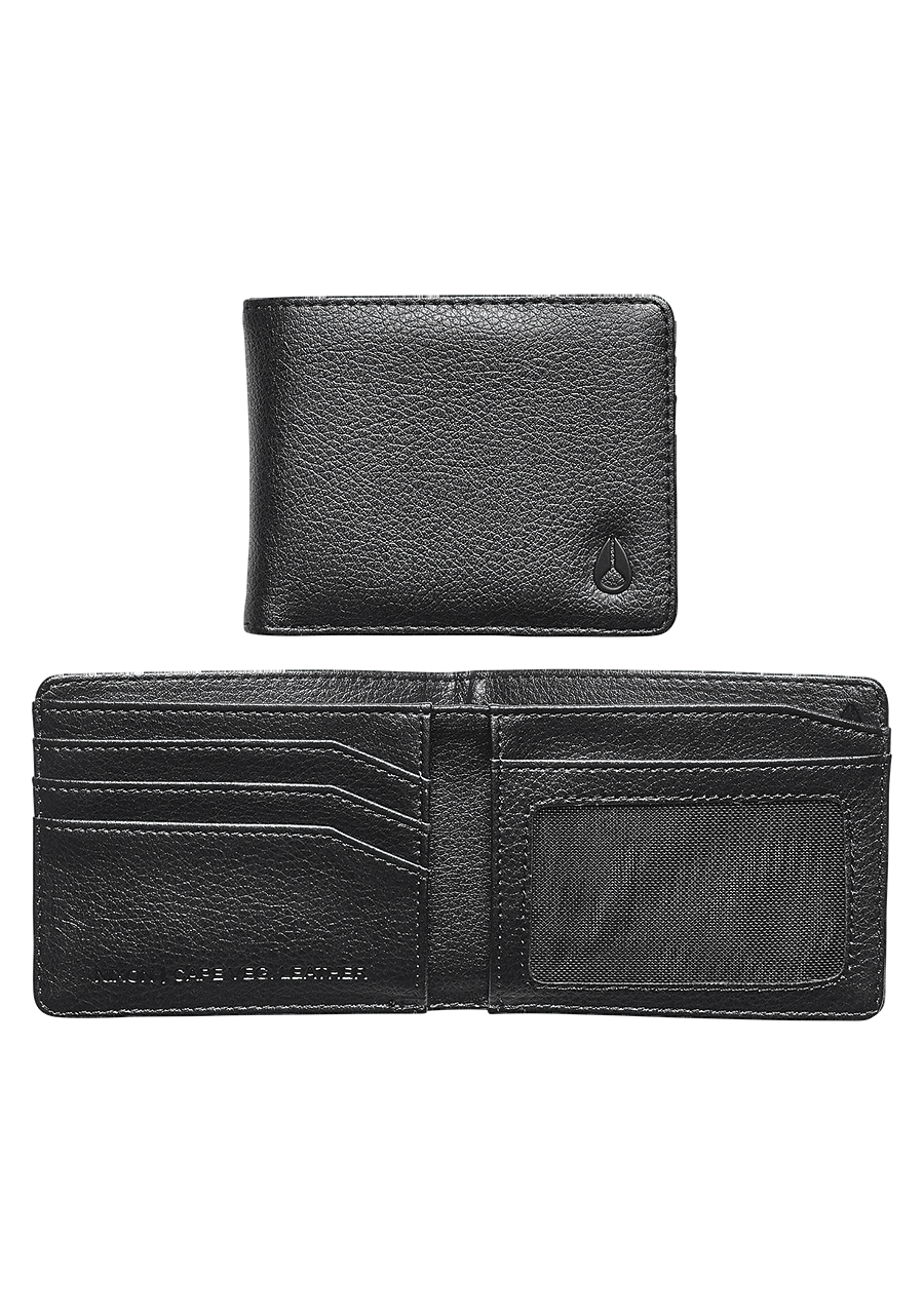 Vegan leather wallet with embossed interior. Features easy access currency sleeve, mesh ID window, and custom metal logo rivet at front.
