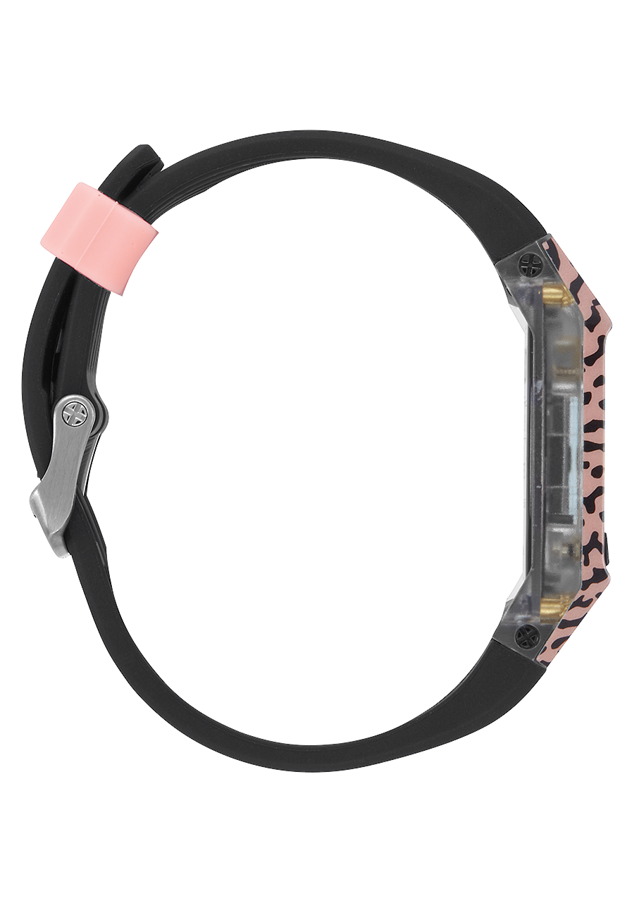 31mm, 100 meter/10 ATM, custom injection molded TR90. The case is transparent with matte texture and has either transparent color or a custom hi-resolution graphic applied in mold. Custom molded polycarbonate triple gasket pushers, stainless steel screw down caseback, and stainless steel screw bar lugs.