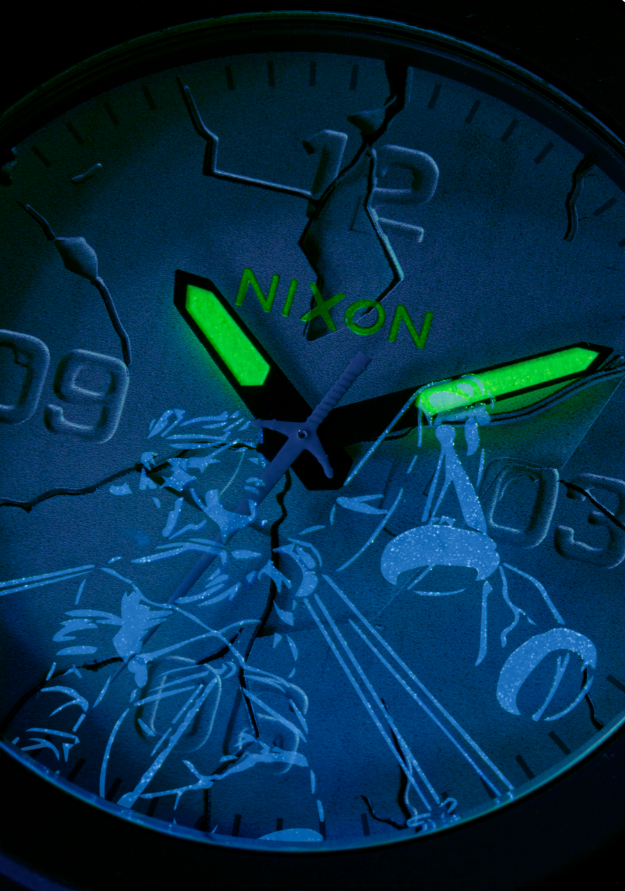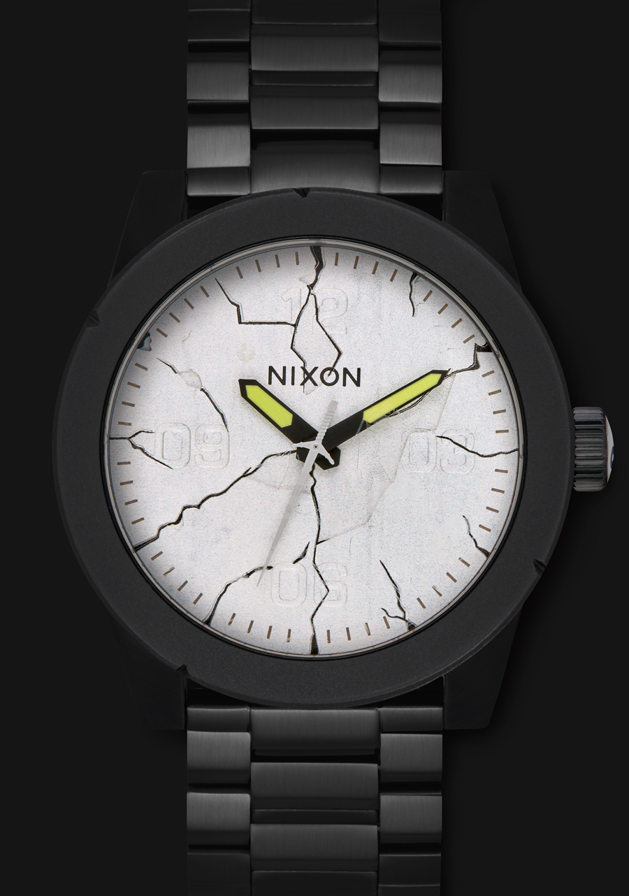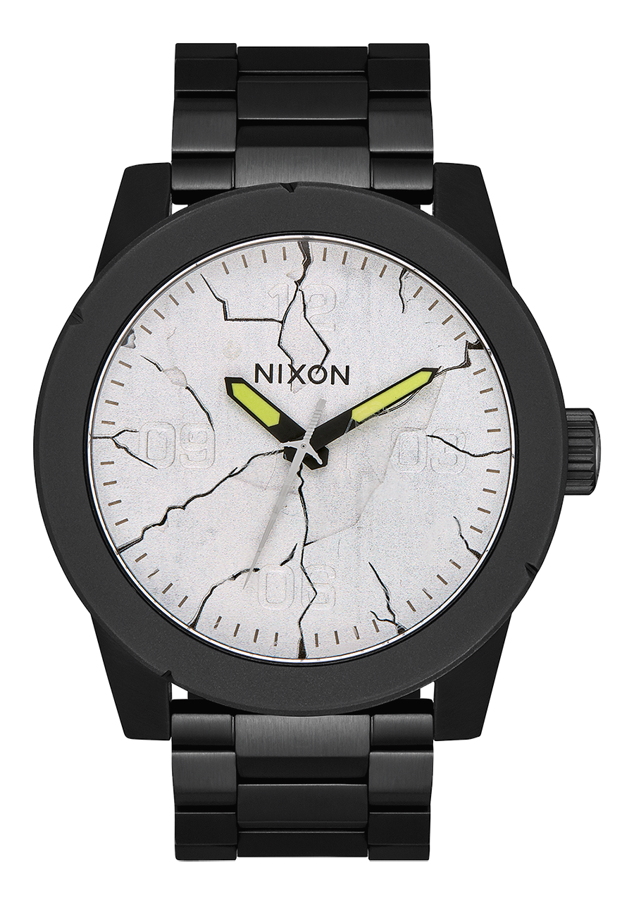 The Nixon Corporal features a 48mm custom solid stainless steel case, a solid stainless steel fixed bezel, and a hardened mineral crystal.