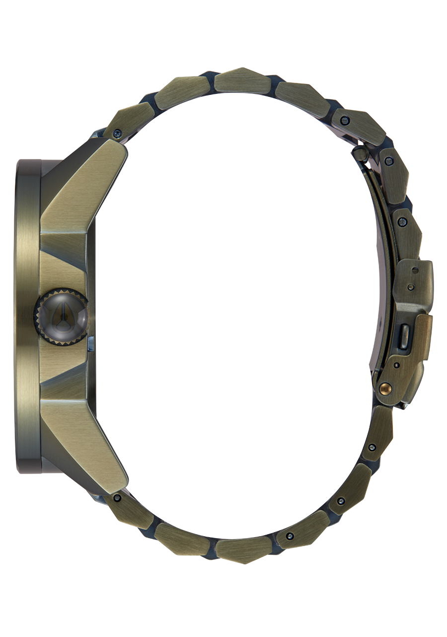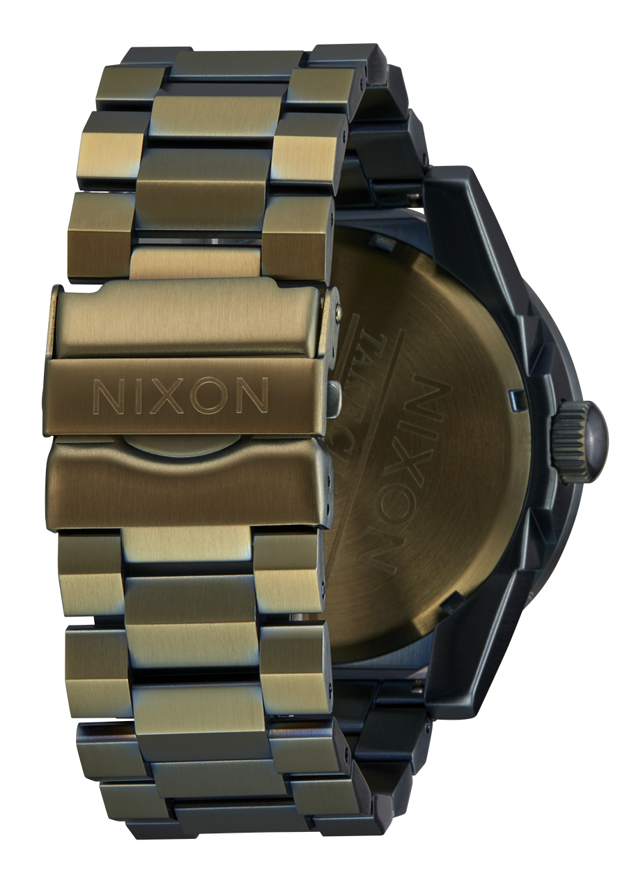 The Nixon Corporal features a 48mm custom solid stainless steel case, a solid stainless steel fixed bezel, and a hardened mineral crystal.