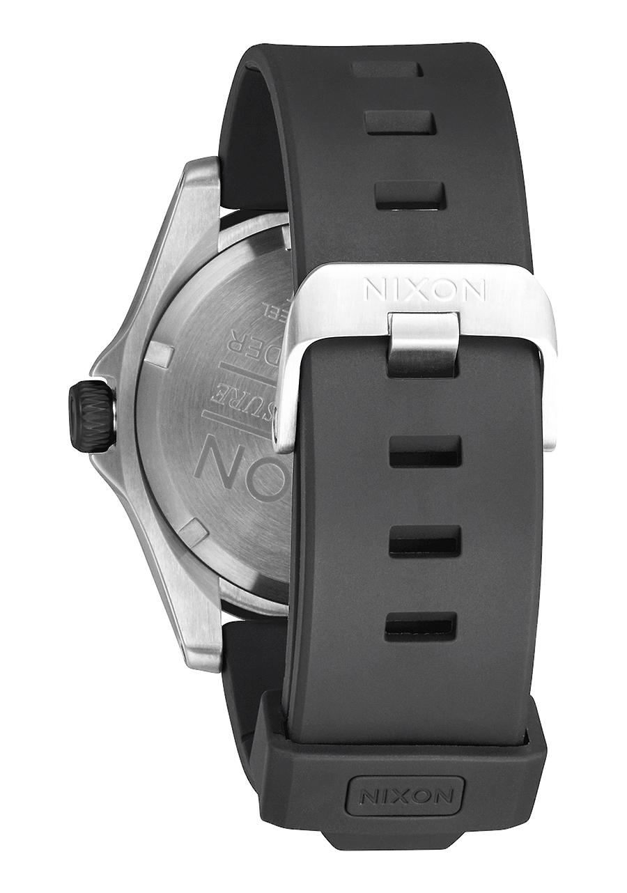 The shark tooth knurled crown is framed with the built-in crown protector. Crown is placed at 9 o’clock to prevent “wrist bite” during activities. Also features a unidirectional rotating bezel for an analog countdown timer.