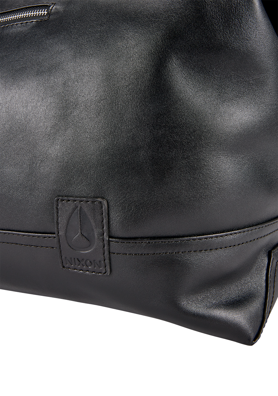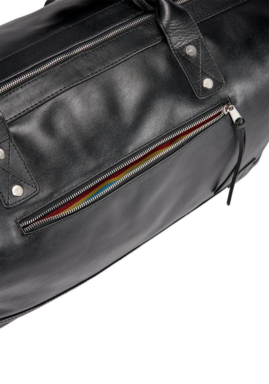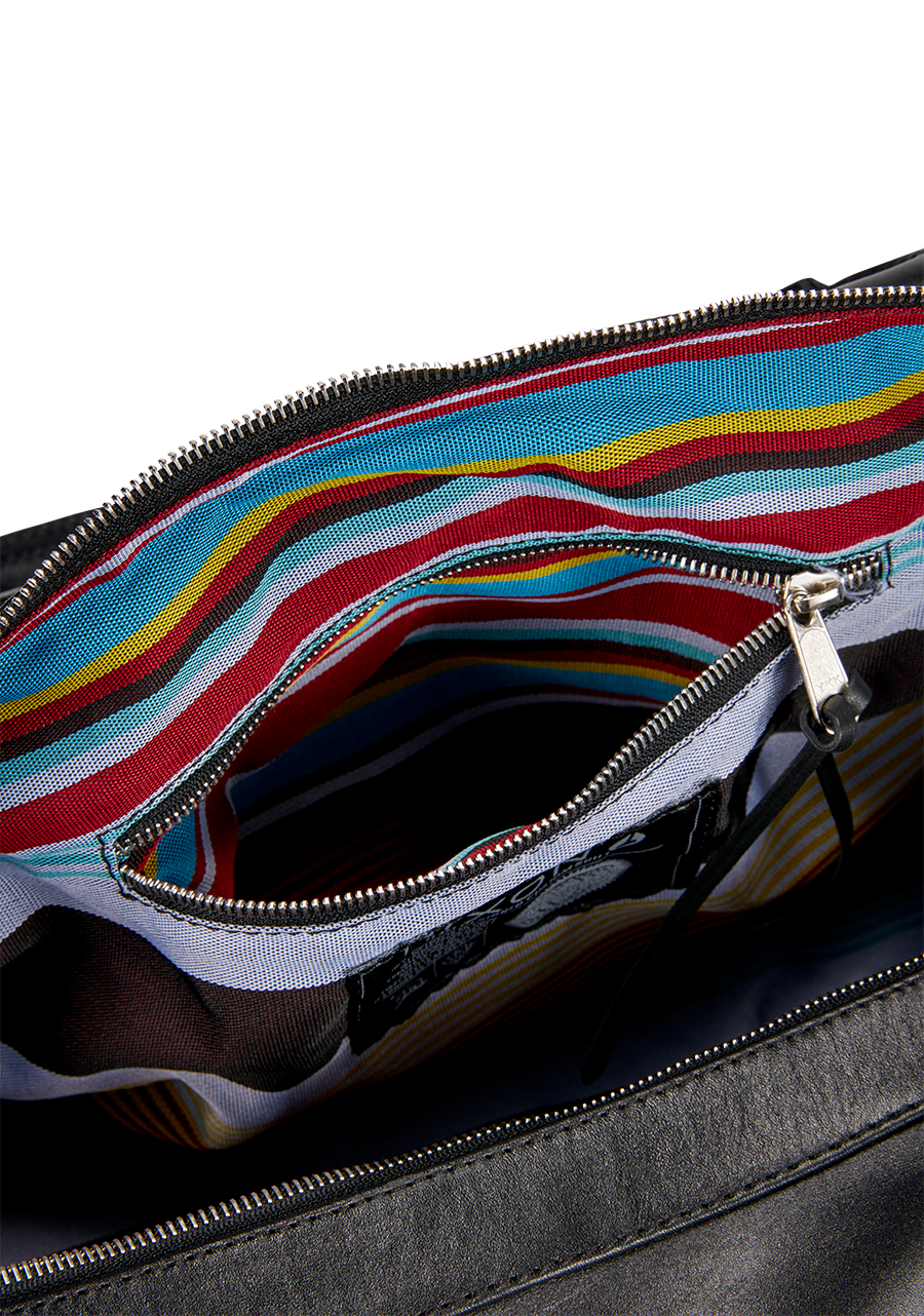Removable and adjustable padded shoulder strap. Padded leather handles. Large main zip opening. Internal and external zip pocket, Debossed logo