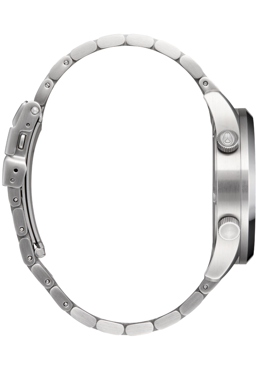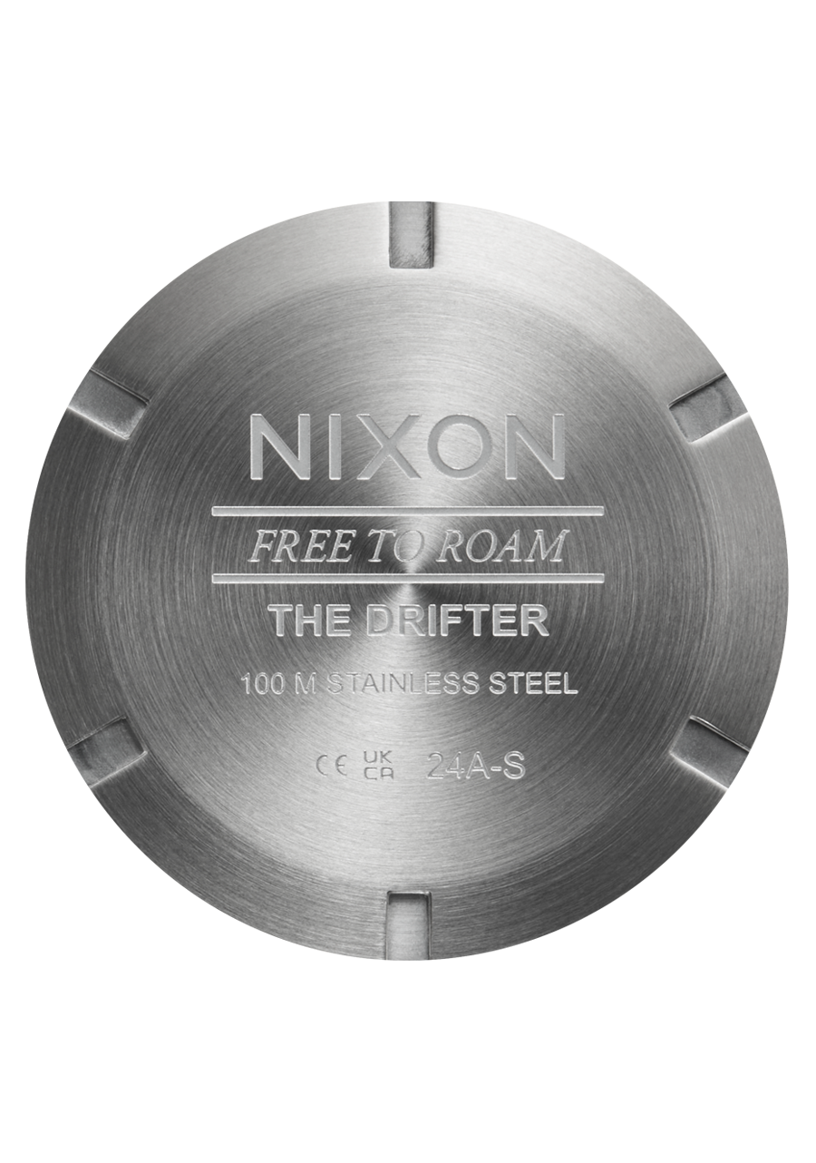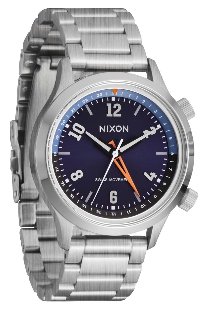 The Nixon Drifter GMT features a custom solid stainless steel case and a stainless steel quick release bracelet.