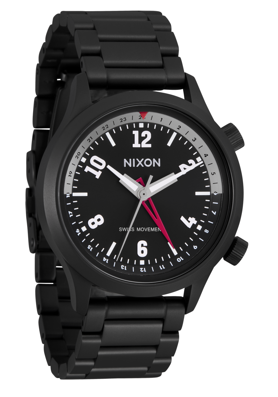 Dial is built with an angled stadium ring on a 24-hour time format and features a moveable "be there" indicator for when you need to mark a certain time. Main dial tracks 12-hour time format and outer ring tracks 24-hour time format for a second time zone. The GMT hand with contrast color tracks your 24-hour time format.