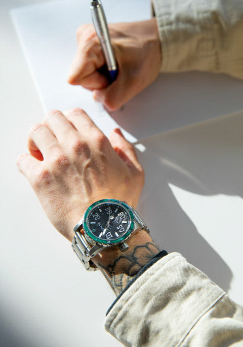 Miyota 8215 Japanese automatic movement, sweeping seconds hand and custom engraved movement rotor point to some of the finer touches on the Diplomatic. They also point to applied numbers and indices on dial & ring featuring a printed seconds track on the unidrectional rotating bezel. Pro-level percsion with a 200m / 20 ATM water rating to prove it.