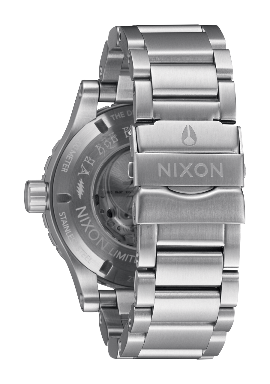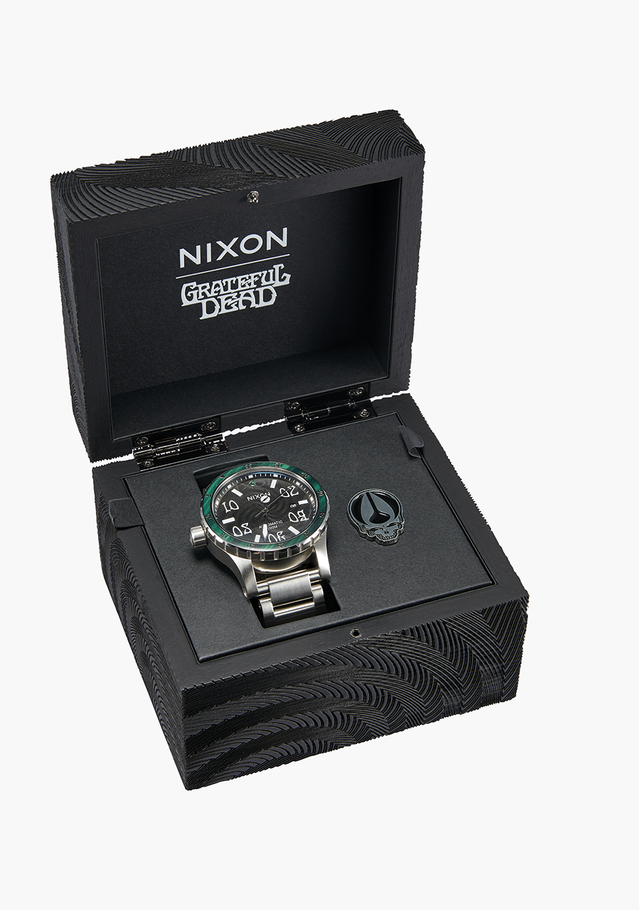 Grateful Dead details from the acetate inlay around the bezel matching the malachite gemstone 12 o'clock marker, down to the custom molded 13-point lightning bolt on the seconds hand as well as etched into the crown. The automatic movement is revealed through the crystal caseback featuring the Steal Your Face skull and a special Dead Head message around the edge. To top things off, a keepsake enamel pin comes with this premium package.