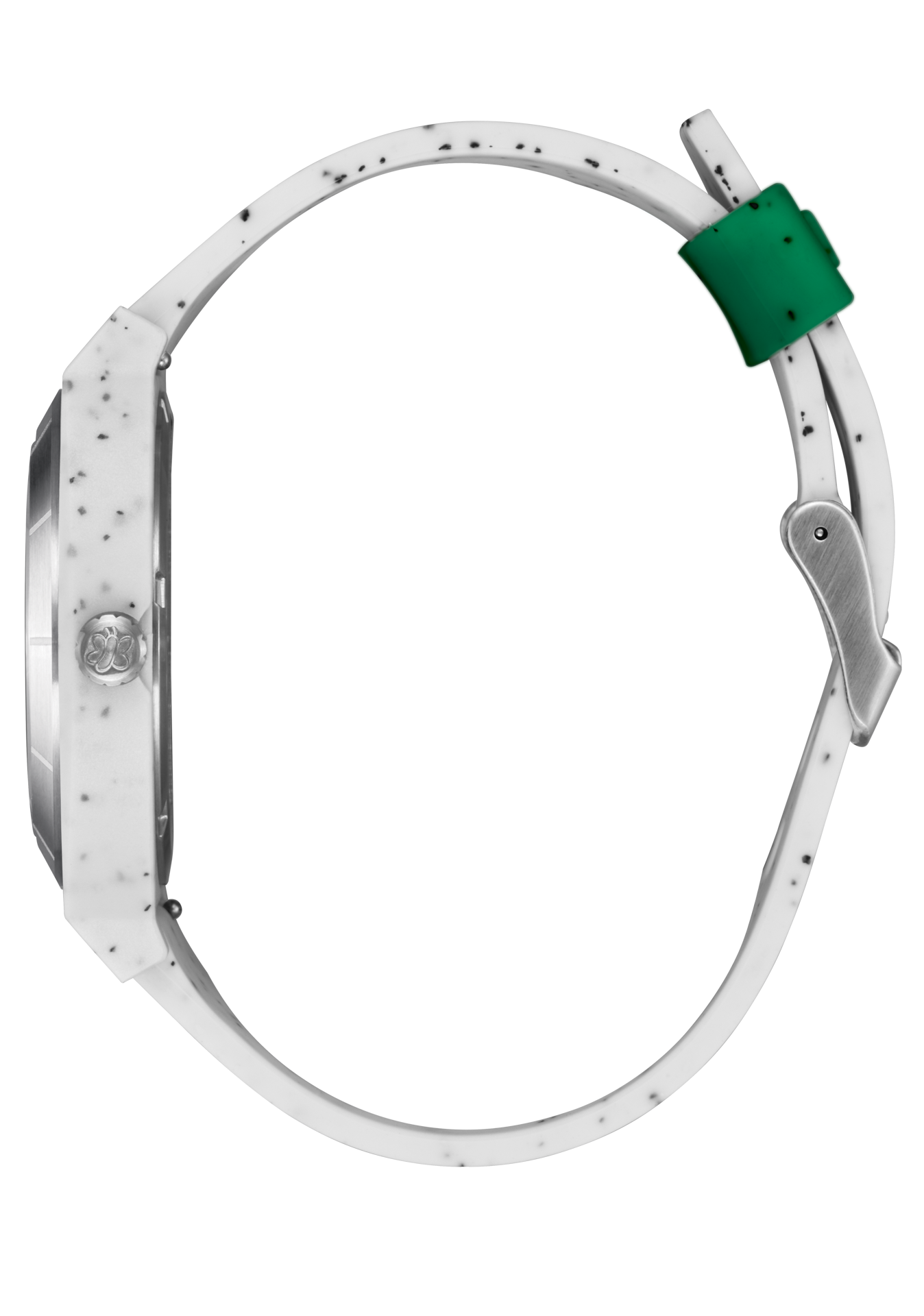 39.5mm recycled plastic watch case and solid steel fixed bezel with a 100 meter / 10 ATM water rating. Includes a hardened mineral crystal, triple gasket stainless steel crown, stainless steel screw down caseback and spring pin lugs.