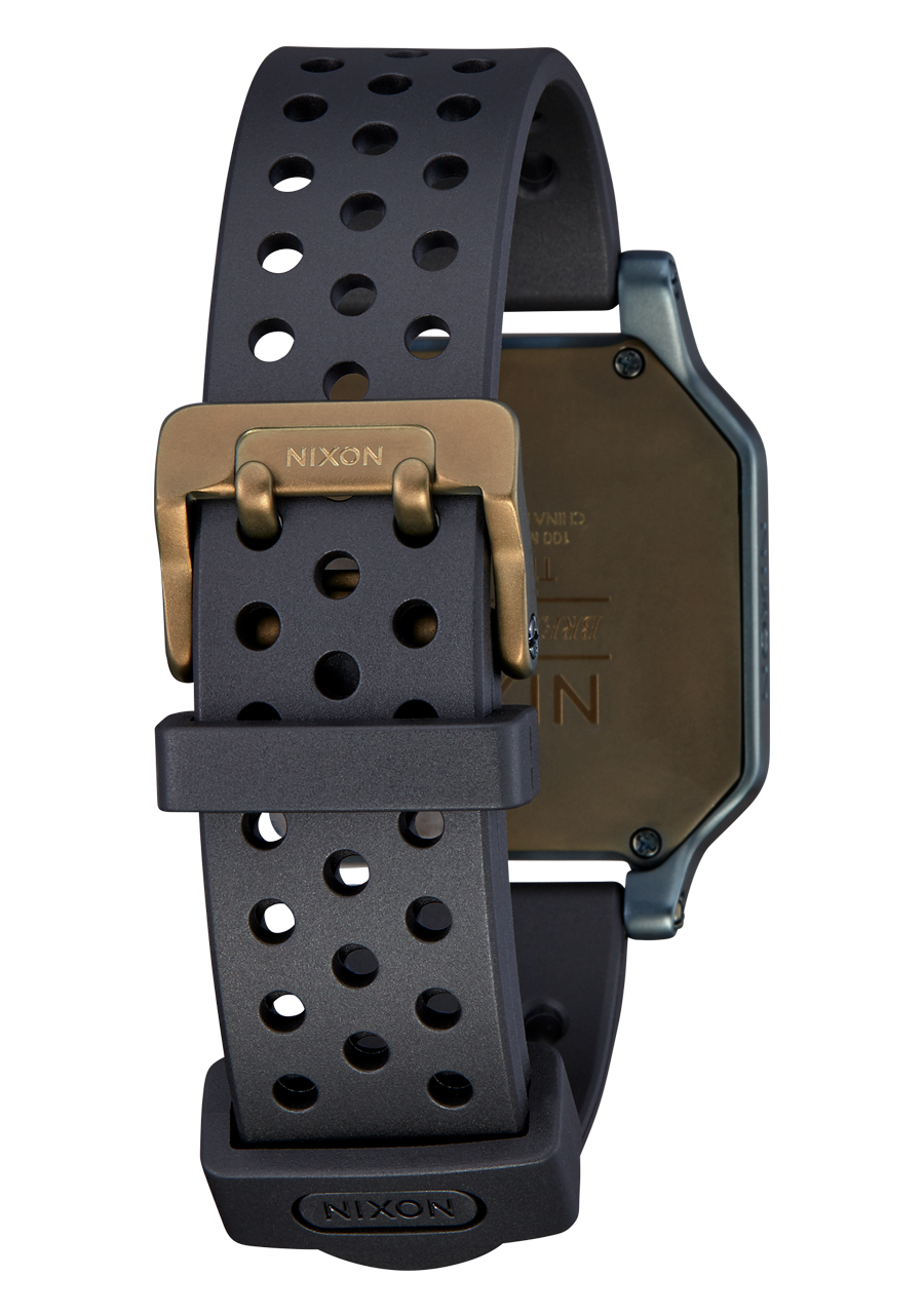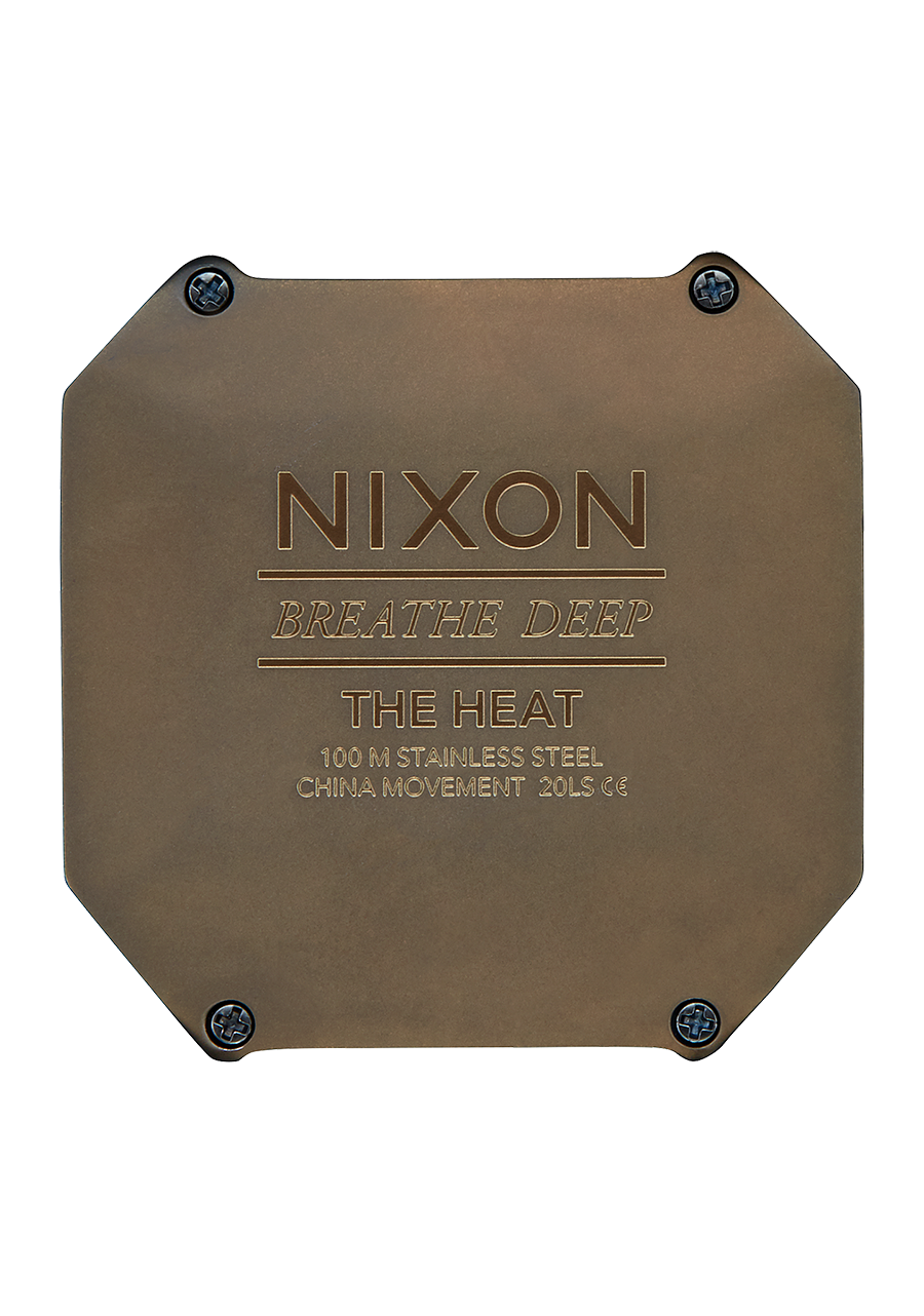 The Nixon Heat features a 38mm custom ultra-thin 8mm stainless steel case with stainless steel pushers and a hardened mineral crystal for protection. The band is a 20mm injection molded rubber strap with a perforated design, engineered for durability, breathability, and comfort. The watch is designed for maximum performance in sports, offering robust protection against impacts and water resistance up to 100 meters / 10 ATM.