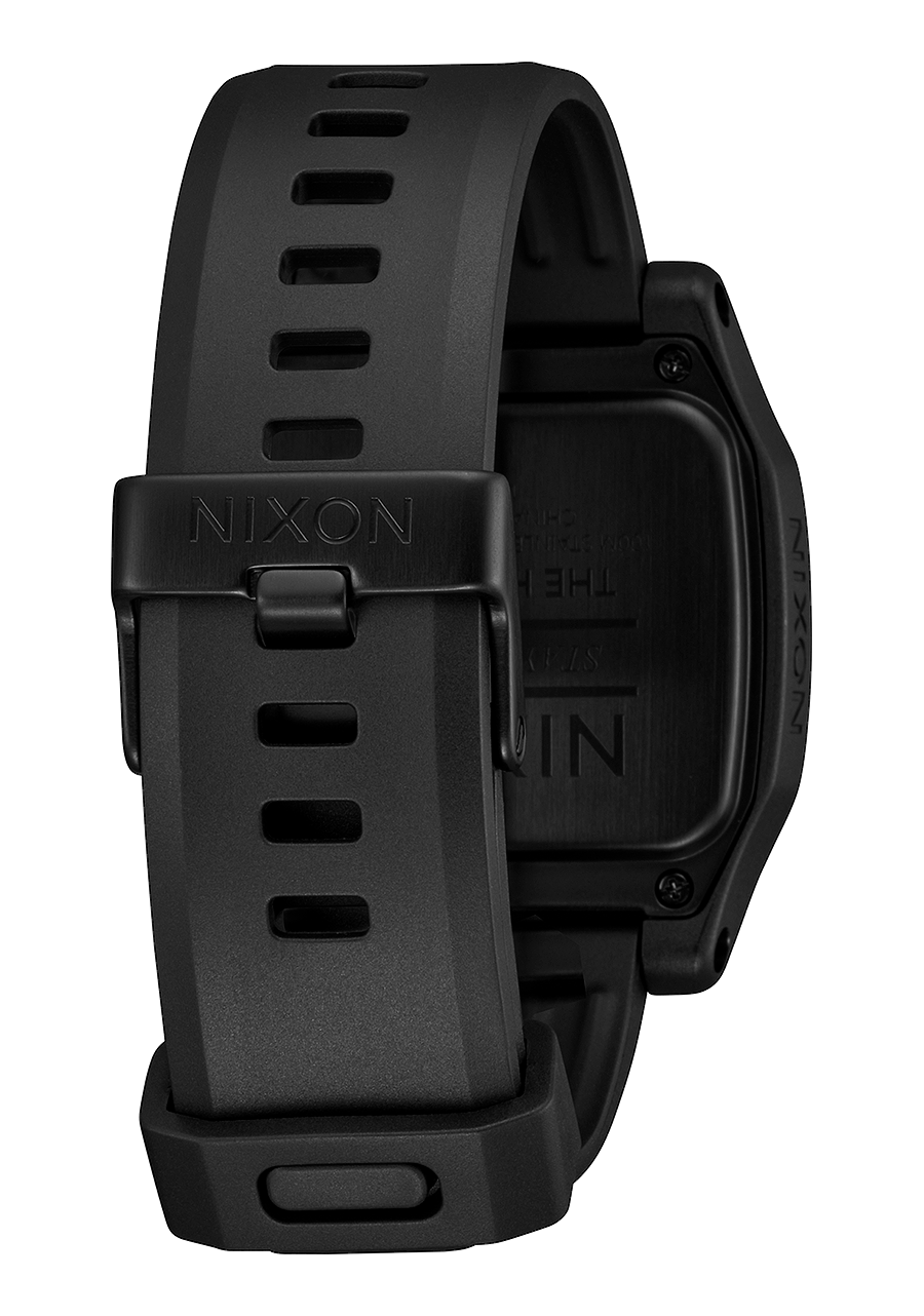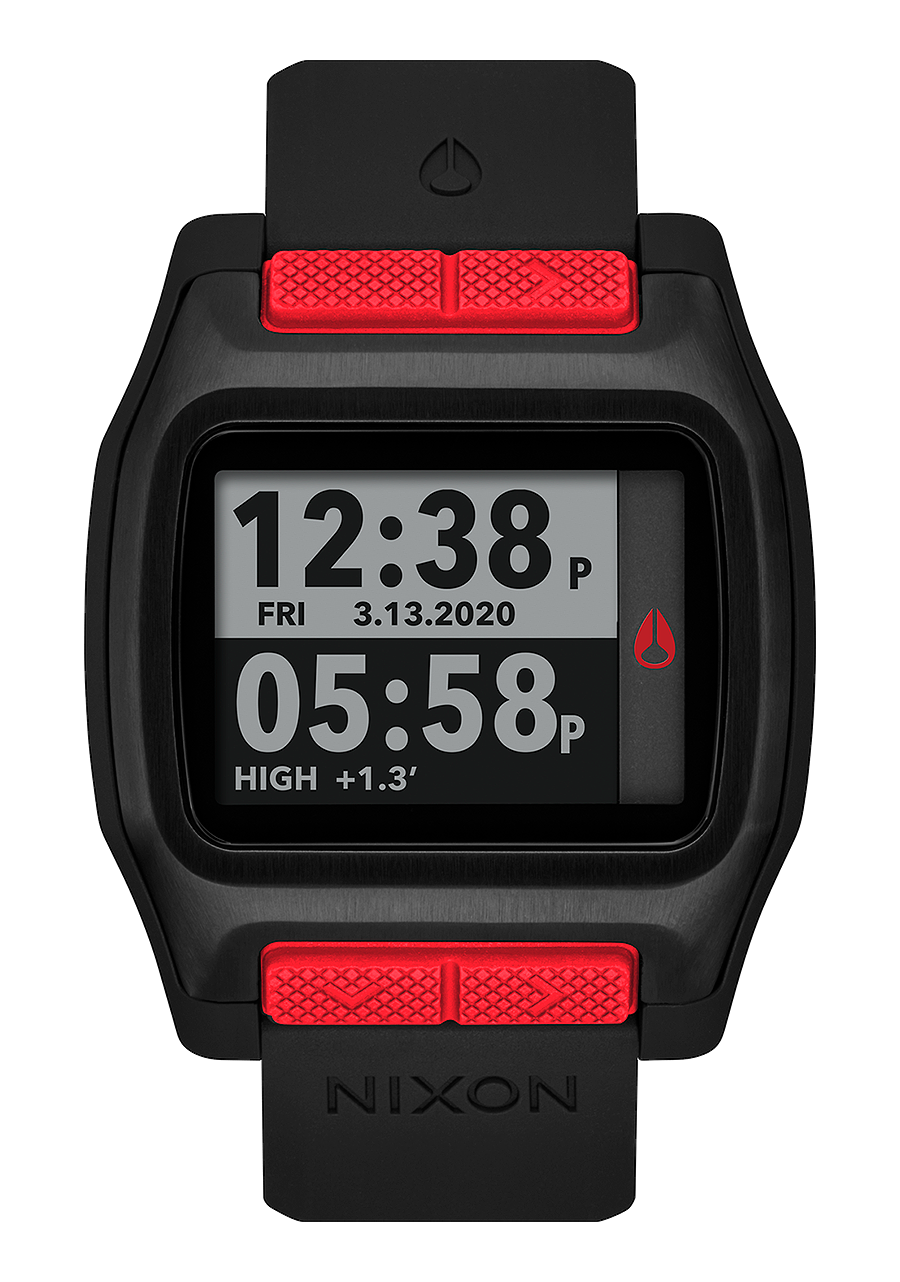 The Nixon High Tide watch is designed to be highly comfortable and durable. The strap is a rubber blend that is injection-molded for maximum wearability and secured by a double-locking looper. This design, similar to a high-quality wetsuit, supports both daily wear and use under wetsuits, providing a comfortable fit during surfing activities with its 100 meter / 10 ATM water rating.