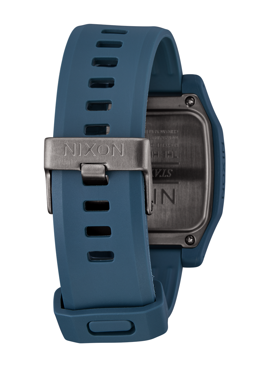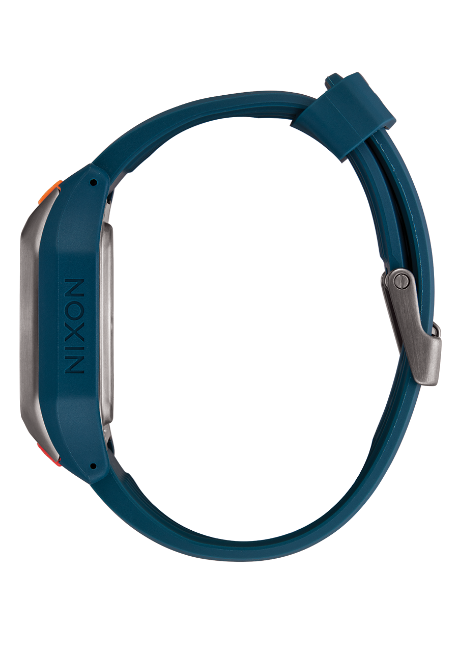 The Nixon High Tide watch is designed to be highly comfortable and durable. The strap is a rubber blend that is injection-molded for maximum wearability and secured by a double-locking looper. This design, similar to a high-quality wetsuit, supports both daily wear and use under wetsuits, providing a comfortable fit during surfing activities with its 100 meter / 10 ATM water rating.