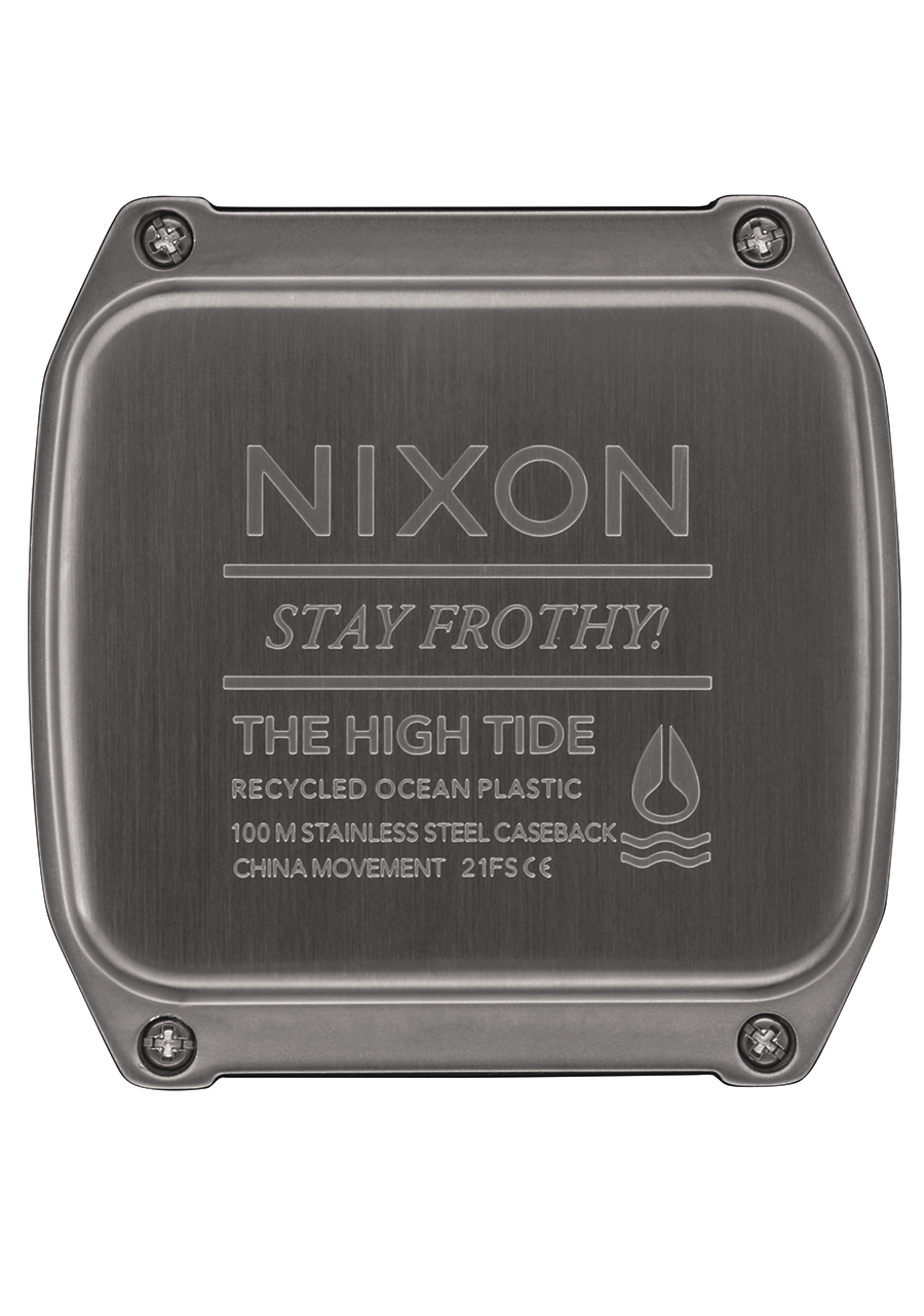 The Nixon High Tide watch features a case reinforced by injection molding and a stainless steel bezel for added protection. The strap is made from a durable rubber blend. The High Tide incorporates recycled ocean plastics into the case, which are processed to restore the original integrity of the plastic, making these watches eco-friendly.