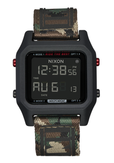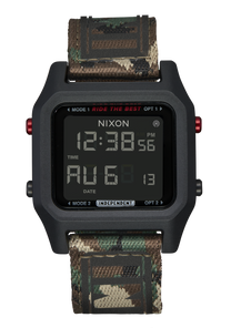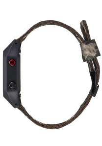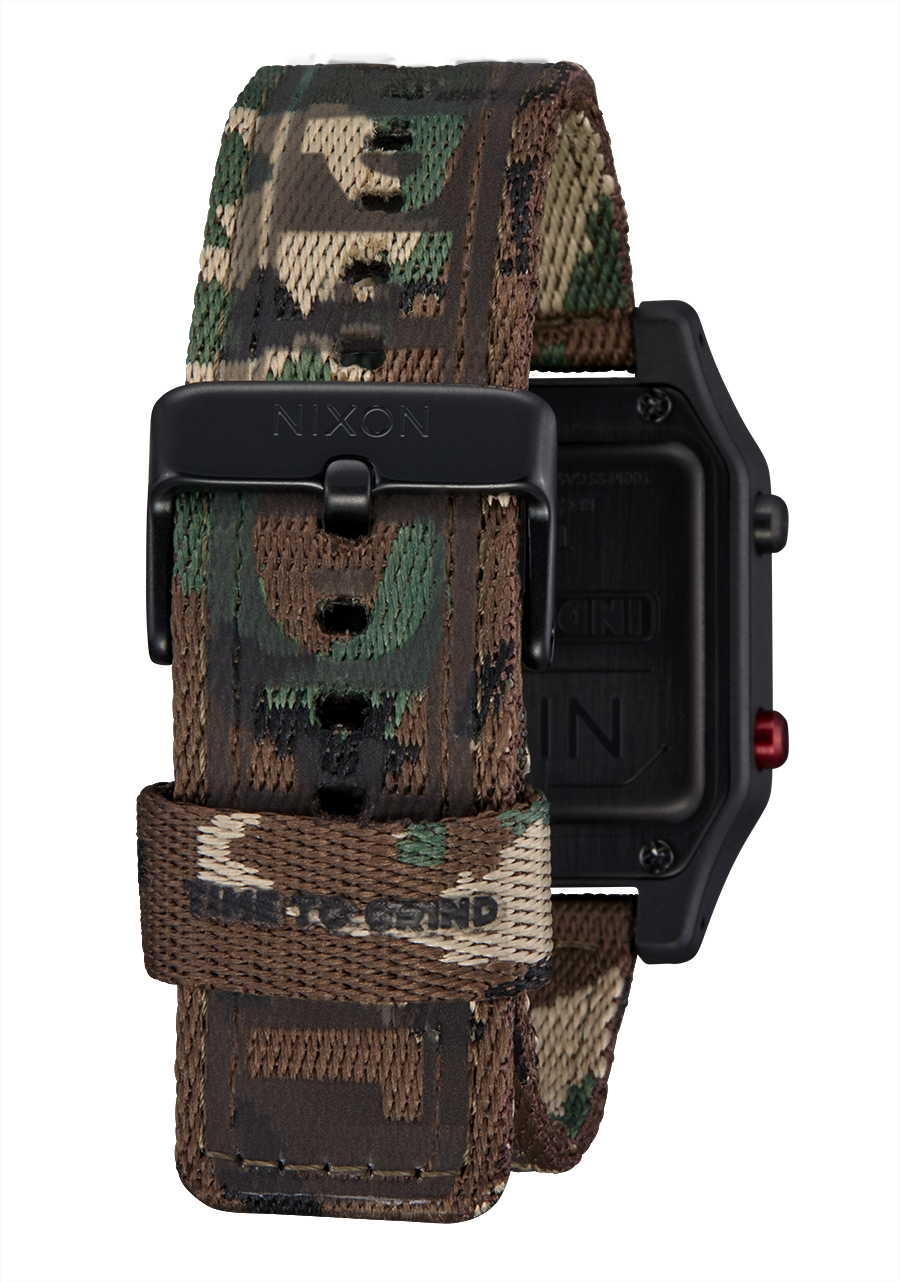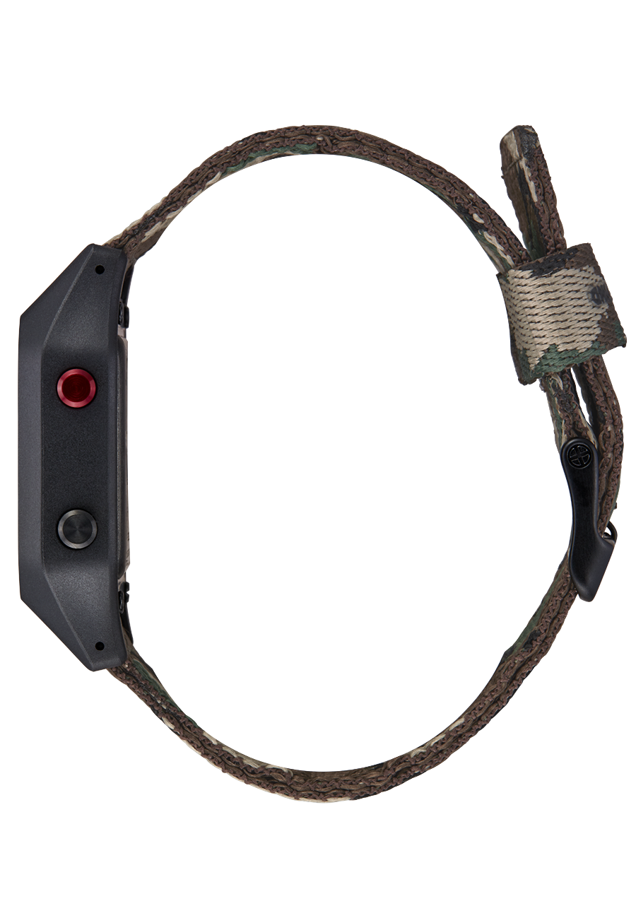 The “Ride the Best” mantra appears on the face, while a customizable display layout allows you to view any two functions simultaneously. Functions include: time of day, day/date with auto calendar through 2099, chronograph with 1/100 second resolution, timer, and alarm. A camouflage band, made from Recycled PET, provides sustainability that stays comfortable no matter how serious the session.