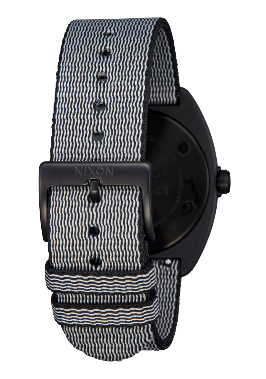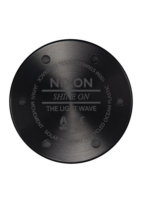 The Nixon Light-Wave watch features a 36mm case diameter made from recycled ocean plastic, with a stainless steel caseback. It includes a 20mm custom recycled ocean plastic woven strap. The dial showcases a semi-transparent dial and a unique design that highlights the solar panel within the watch face.