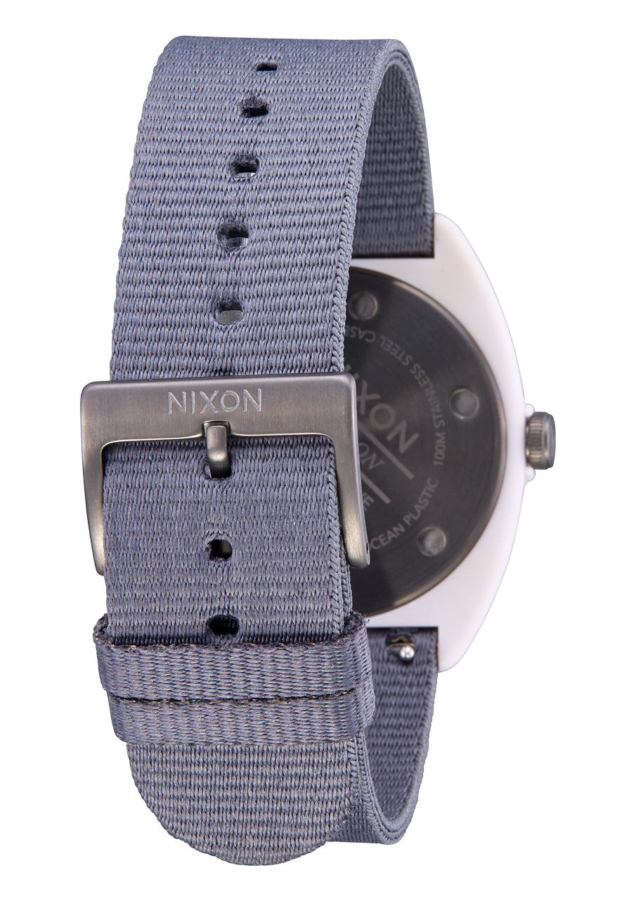 36mm custom recycled ocean plastic injection molded case with a 100 meter / 10 ATM water rating. Comes with a stainless steel caseback.