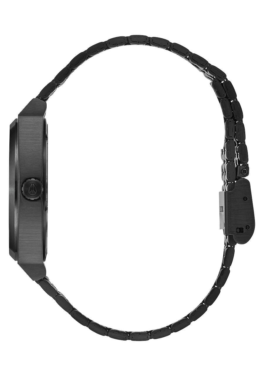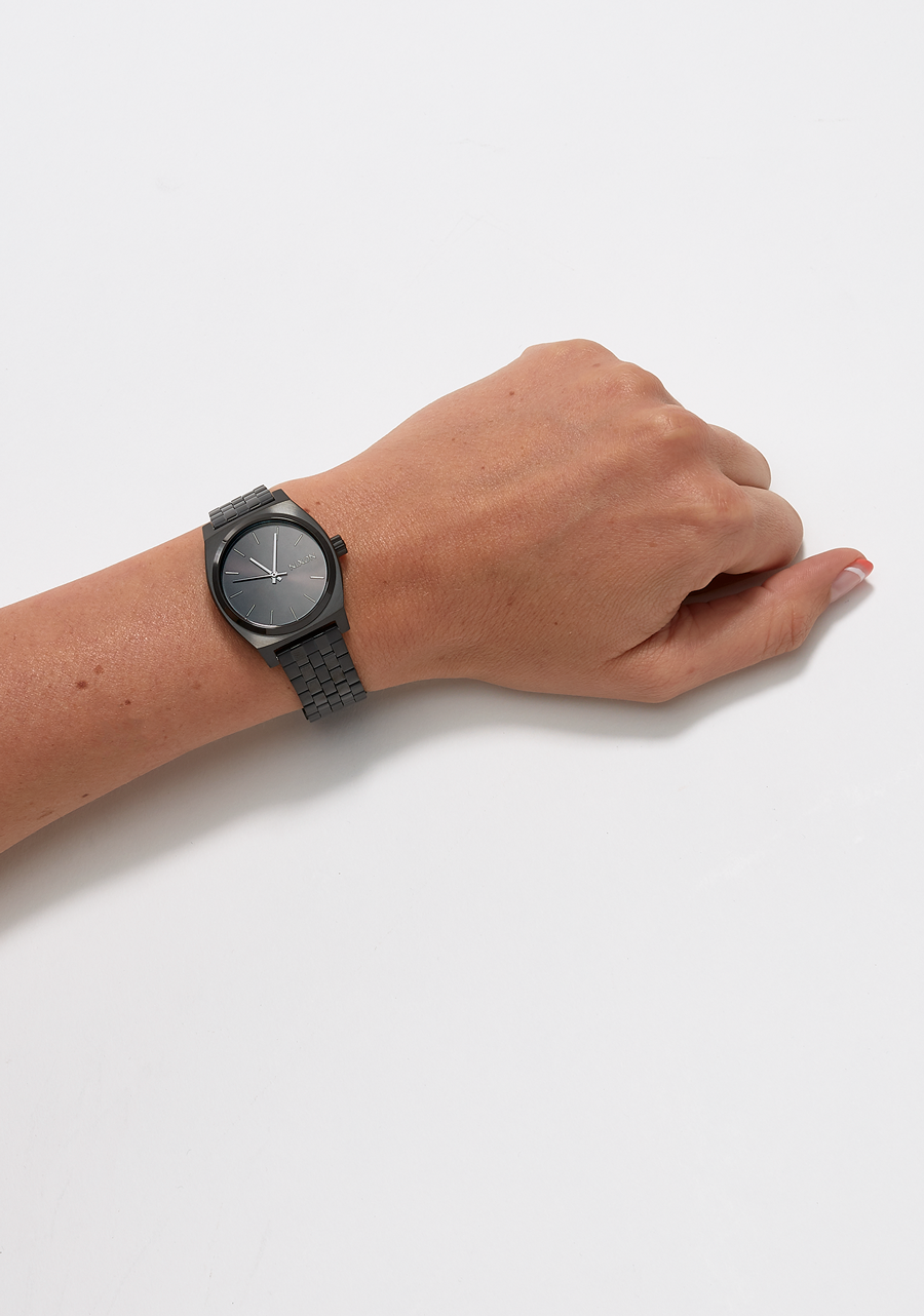 To adjust the stainless steel bracelet of the Medium Time Teller for a secure fit, you can use the sliding adjustment buckle to tighten or loosen the band. This involves sliding the buckle along the band to the desired position. A tool to begin this adjustment is included in the watch box. For more information visit the Nixon blog.