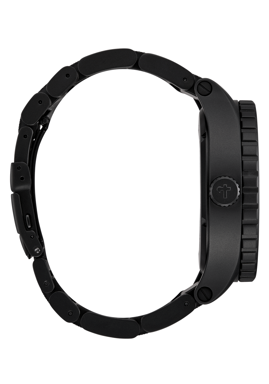 The crown is located on the 9 o'clock side of the case instead of 3 o'clock to prevent "wrist bite" during active use. Uni-directional rotating bezel for an analog countdown timer.