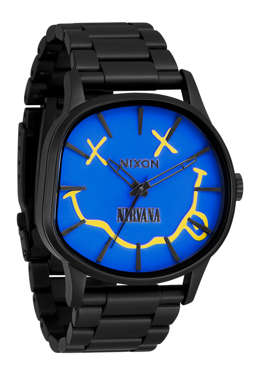 A band of this magnitude deserves a watch like no other. The Nirvana collection features the Sentry Wobble, a case bent to fit the shape of their iconic smiley face graphic. Accompanying the Wobble is the Sentry Leather with a fuzzy sweater-like feel to the band and a polarizing sun-ray dial with angled Nirvana letters as the indices. Lastly, the Time Teller's minimal profile packs a punch with a hit of a black-on-black smiley face and yellow Nirvana logo and text style.