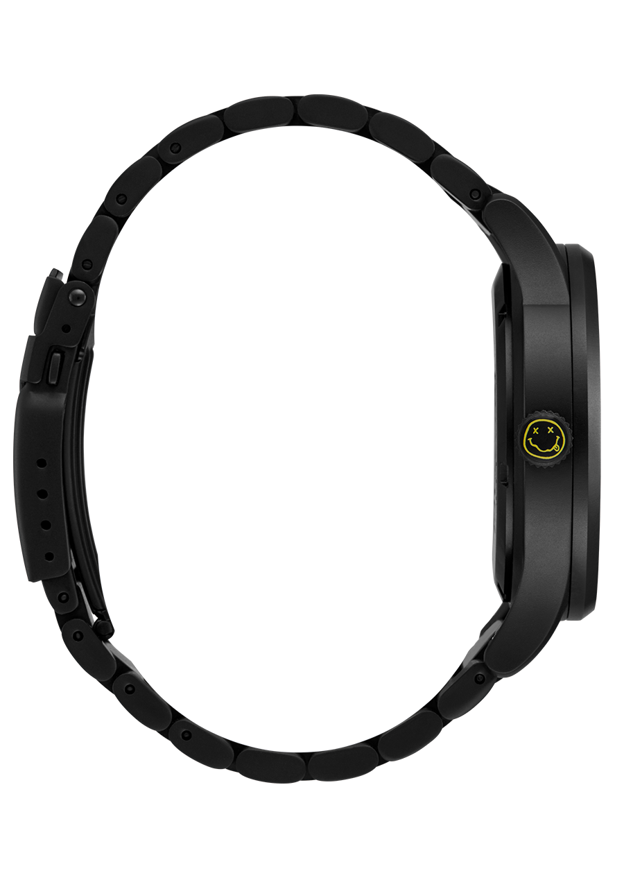 A unique "wobble" case design that matches the curvature of Nirvana's famous hand-drawn smiley face graphic on the dial.