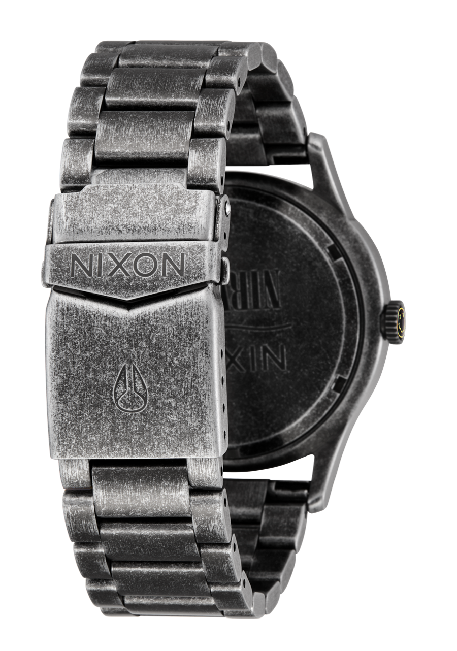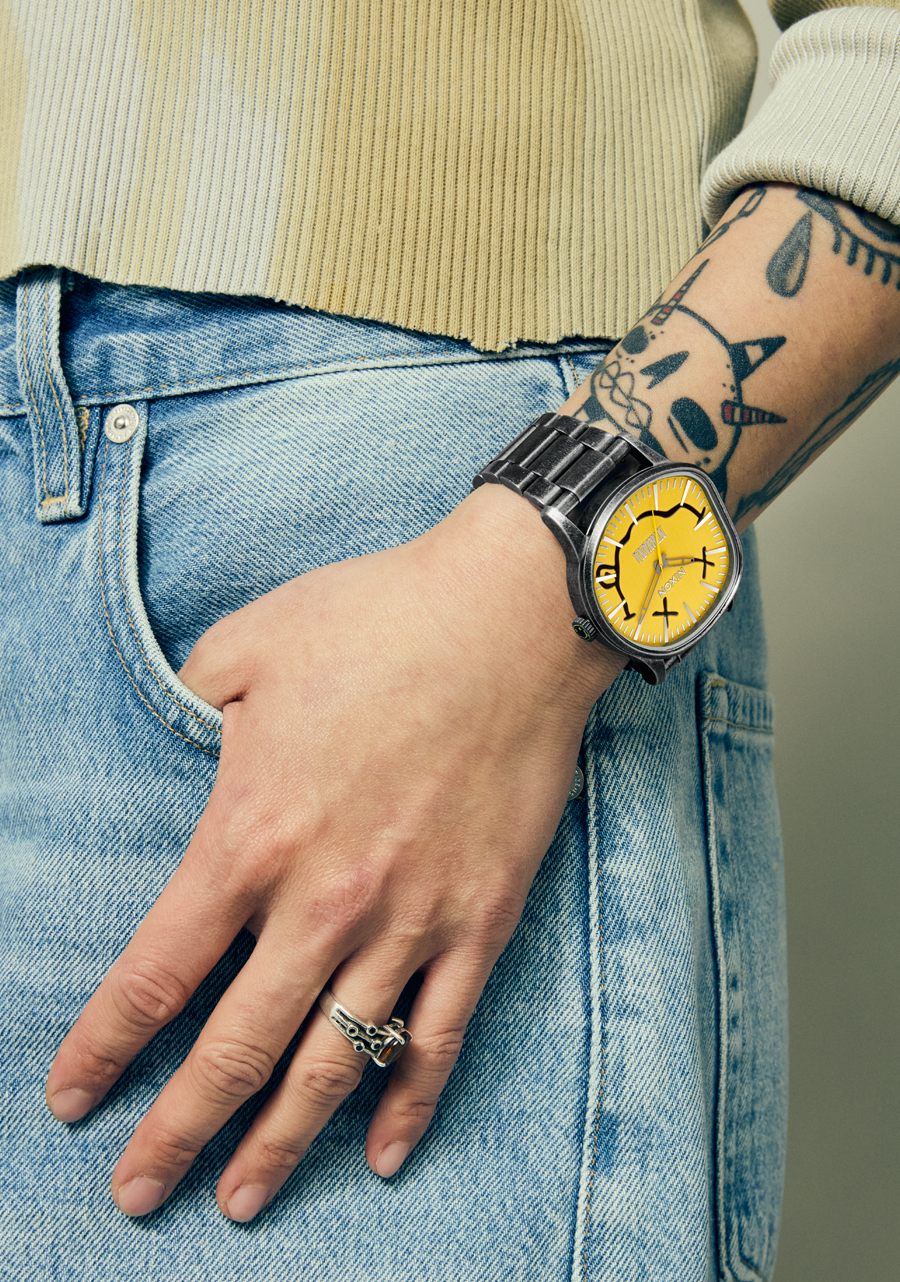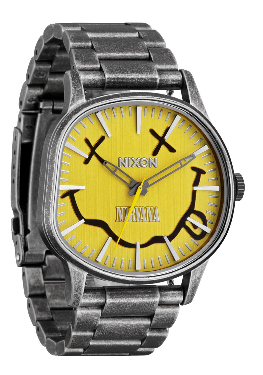 A band of this magnitude deserves a watch like no other. The Nirvana collection features the Sentry Wobble, a case bent to fit the shape of their iconic smiley face graphic. Accompanying the Wobble is the Sentry Leather with a fuzzy sweater-like feel to the band and a polarizing sun-ray dial with angled Nirvana letters as the indices. Lastly, the Time Teller's minimal profile packs a punch with a hit of a black-on-black smiley face and yellow Nirvana logo and text style.