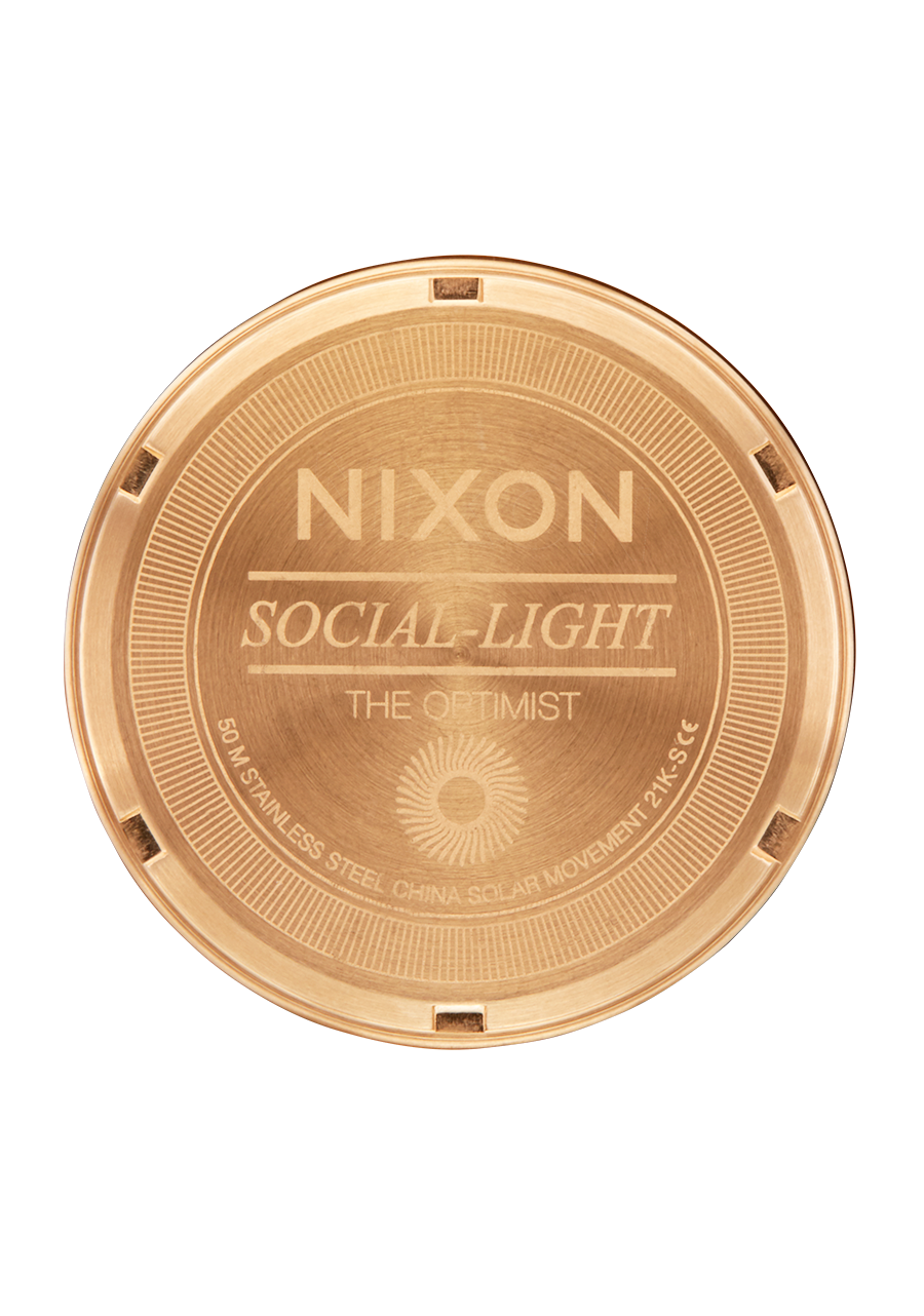 Strut into the future. A modern jewelry look that's loaded with limitless energy, the Optimist is Nixon's social-light timepiece. With the combination of geometric details, polished finishes and the solar-cell to keep her ticking into eternity, the Optimist is here and her future is looking bright.