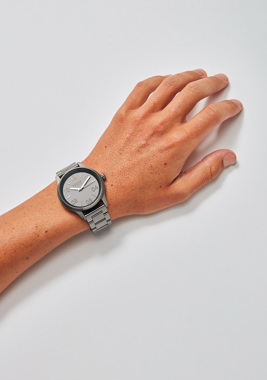 42mm custom solid stainless steel case with a 100 meter / 10 ATM water rating. Comes with a hardened mineral crystal, stainless steel screw down caseback and spring pin lugs.