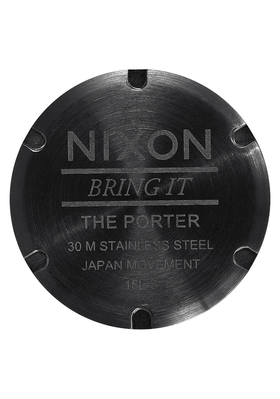 The Nixon Porter features a custom stainless steel case and bracelet. The watch is designed for everyday durability, with a hardened mineral crystal, double gasket crown, and screw-down stainless steel caseback for enhanced protection.