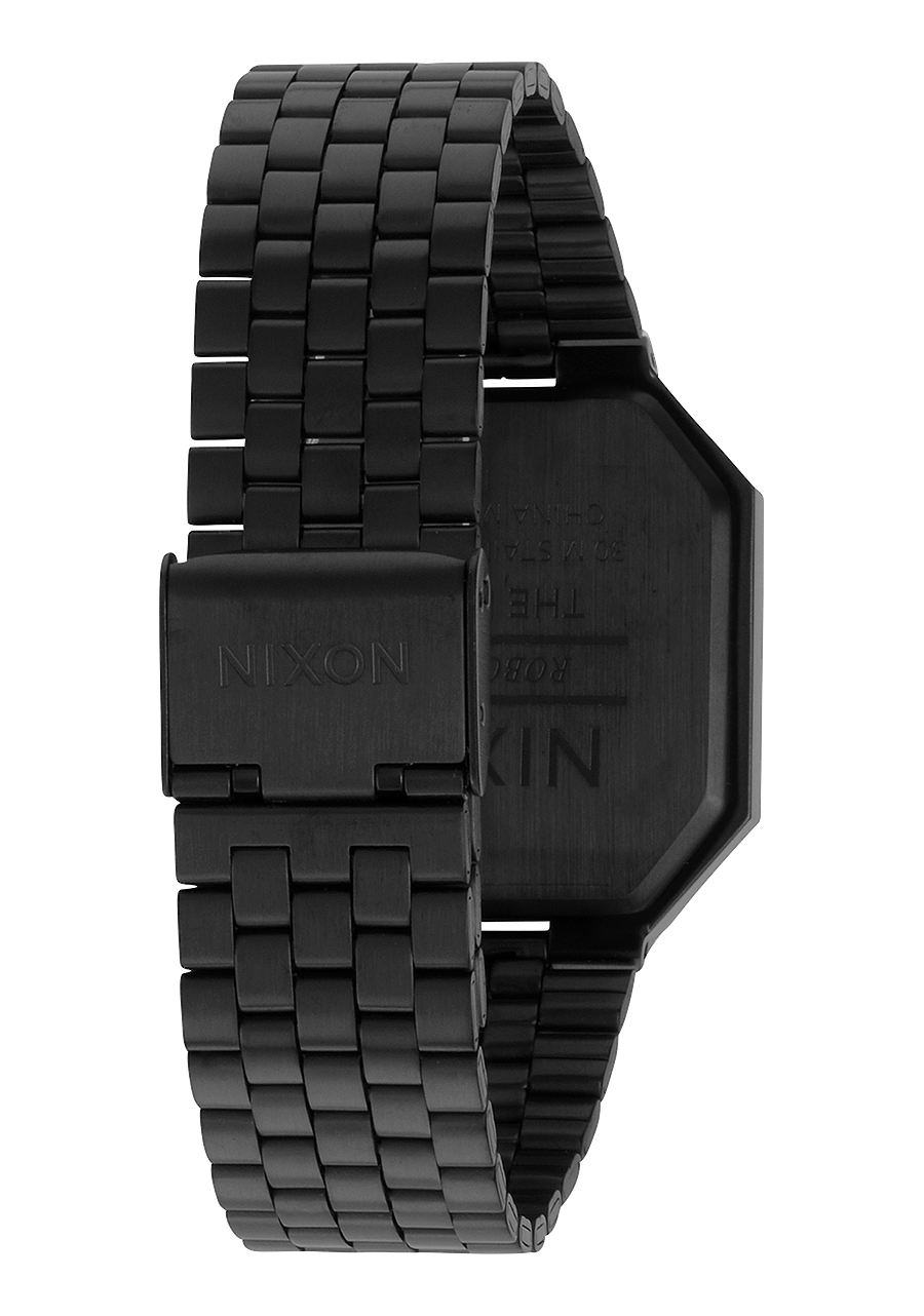 The Nixon Re-Run watch features a case made of solid stainless steel and hardened mineral crystal, providing durability for daily wear. The band is a 5-link stainless steel jewelry-style bracelet with a stainless steel locking clasp, ensuring a secure fit. The watch is designed to be durable enough for active wearers, with features like injection-molded polyurethane pushers to enhance its throwback design and functionality.