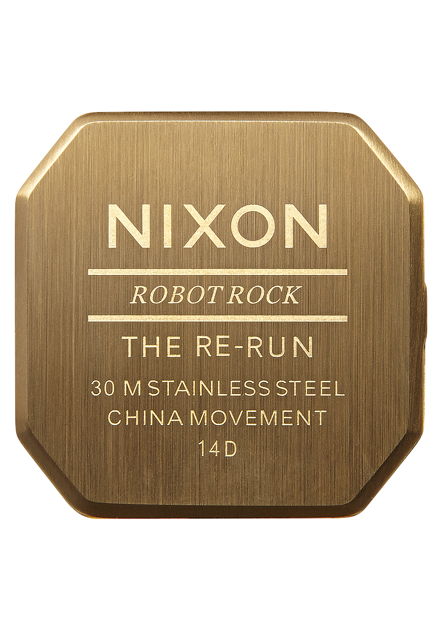 The Nixon Re-Run watch features a case made of solid stainless steel and hardened mineral crystal, providing durability for daily wear. The band is a 5-link stainless steel jewelry-style bracelet with a stainless steel locking clasp, ensuring a secure fit. The watch is designed to be durable enough for active wearers, with features like injection-molded polyurethane pushers to enhance its throwback design and functionality.