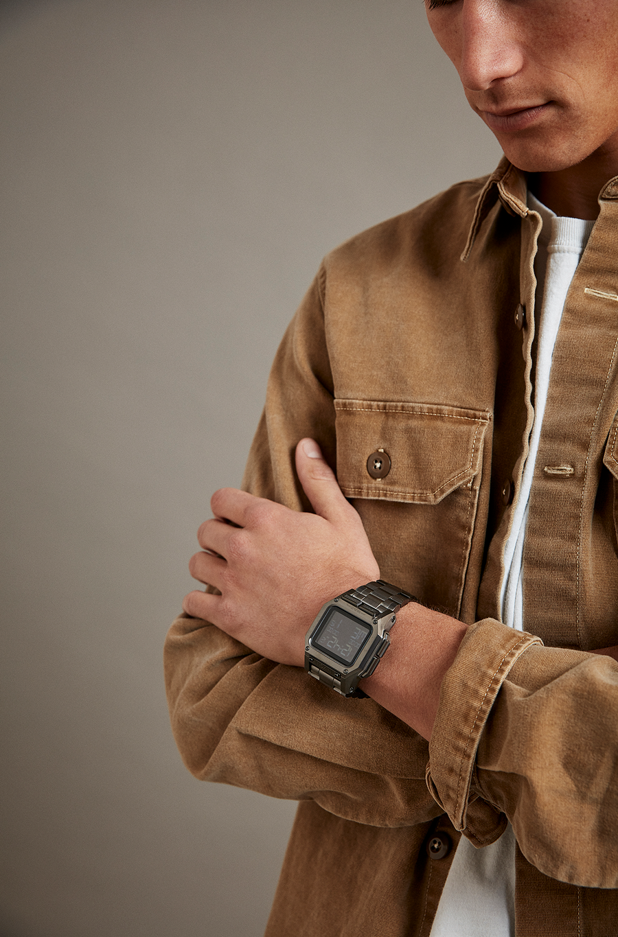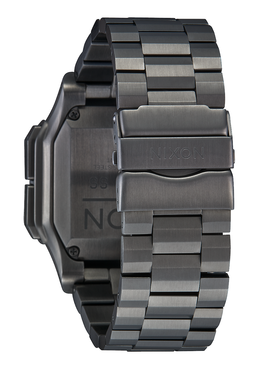 46mm custom injection molded stainless steel case with a 100 meter / 10 ATM water rating. Custom digital LCD module encased in a protective PU jacket and Poron foam padding for super tough shock absorption and durability. Comes with stainless steel pushers located at 6 and 9 o'clock, hardened mineral crystal, stainless steel bezel, solid stainless steel screw down caseback and screw pins.