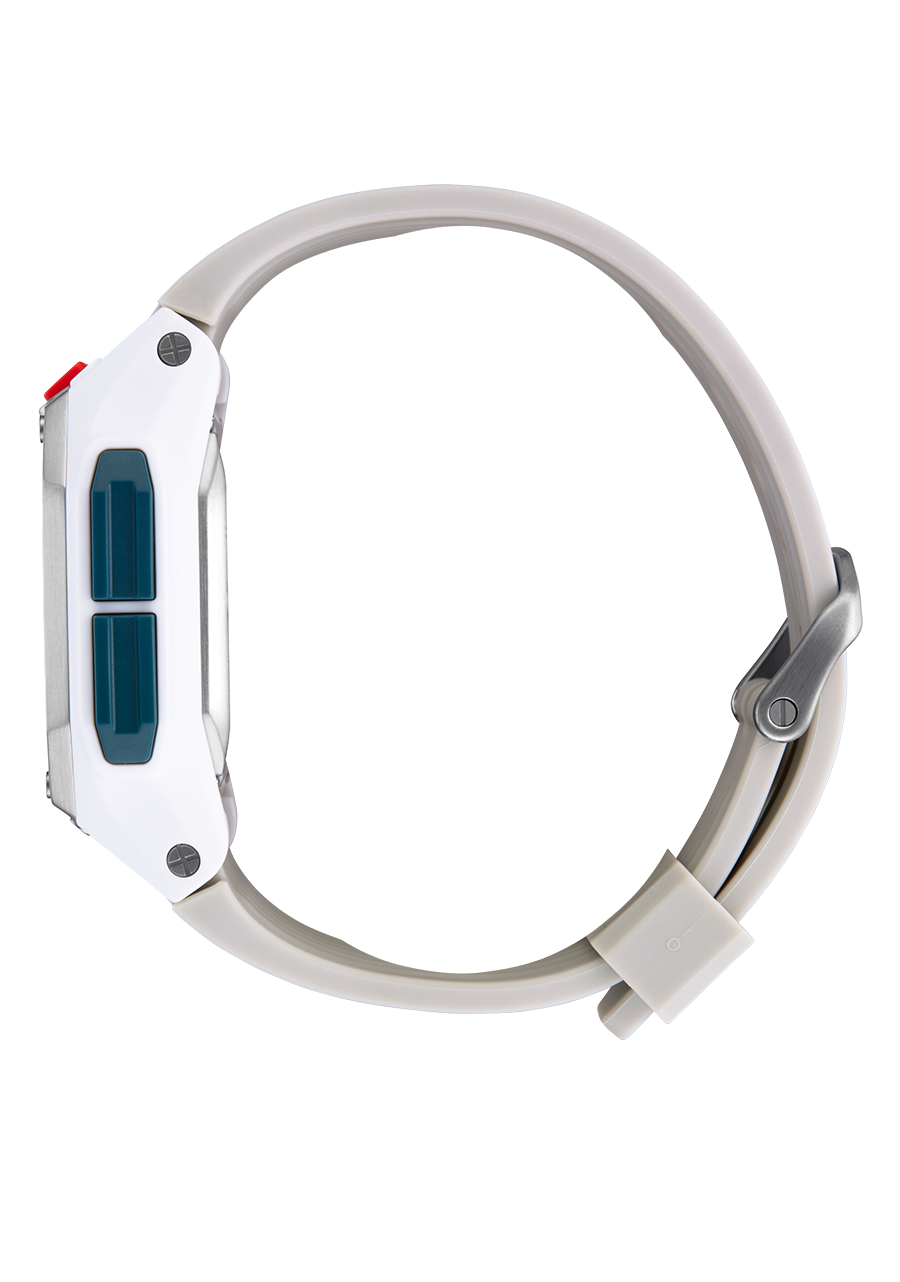 46mm custom injection molded TR-90 case with a 100 meter / 10 ATM water rating. Custom digital LCD module encased in a protective PU jacket and Poron foam padding. Comes with polycarbonate pushers located at 6 and 9 o'clock, hardened mineral crystal, stainless steel bezel, solid stainless steel screw down caseback and screw pin lugs.