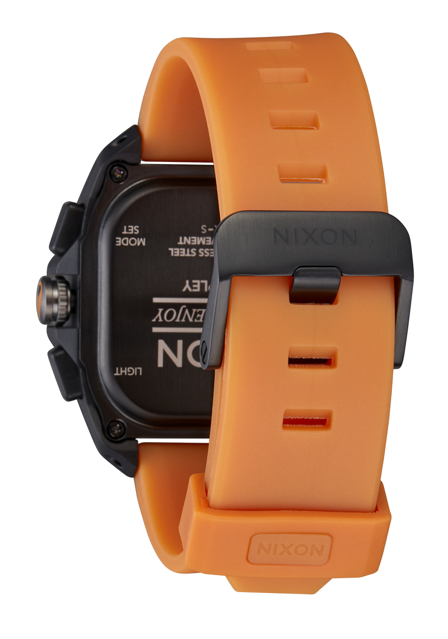 The Nixon Ripley watch is constructed with durable materials, including a stainless steel top plate and a shock-resistant module to protect against impacts. The watch features a hardened mineral crystal for the face and a silicone band for comfort. This construction ensures the Ripley is suitable for both outdoor adventures and everyday use.