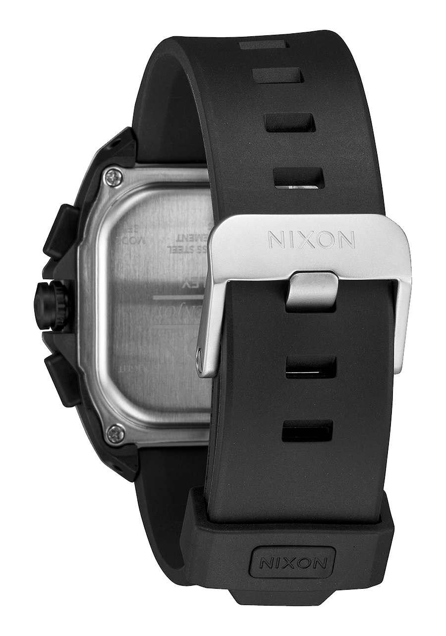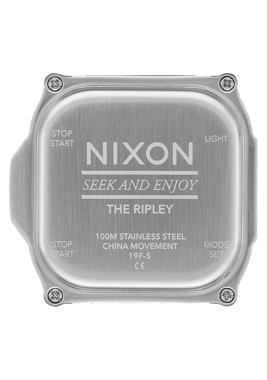 The Nixon Ripley watch is constructed with durable materials, including a stainless steel top plate and a shock-resistant module to protect against impacts. The watch features a hardened mineral crystal for the face and a silicone band for comfort. This construction ensures the Ripley is suitable for both outdoor adventures and everyday use.
