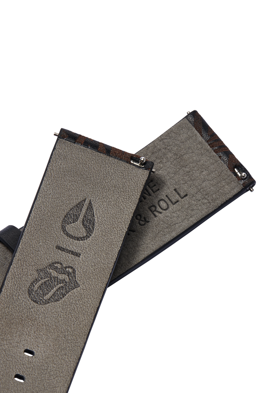 A soft, tanned leather band gets tattooed, referencing the Stones’ iconic Tattoo You album. The subtle yet intricate design looks good on any watch. Lined with supple nubuck, it feels broken in right out of the box.