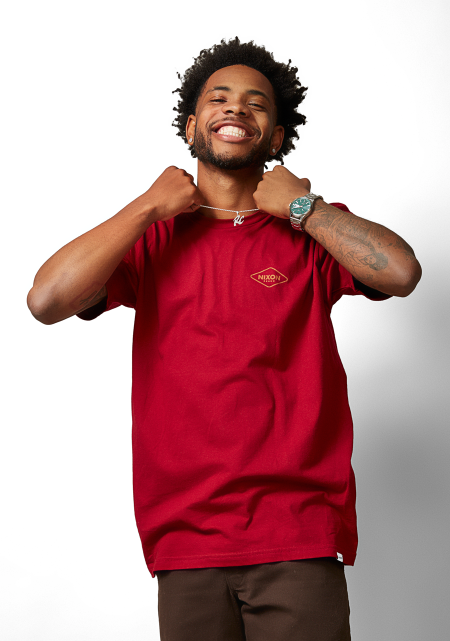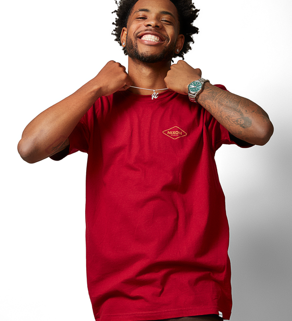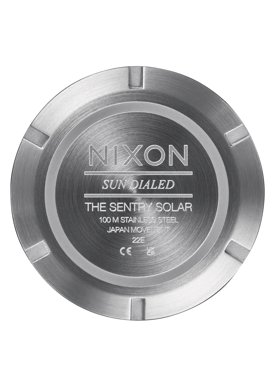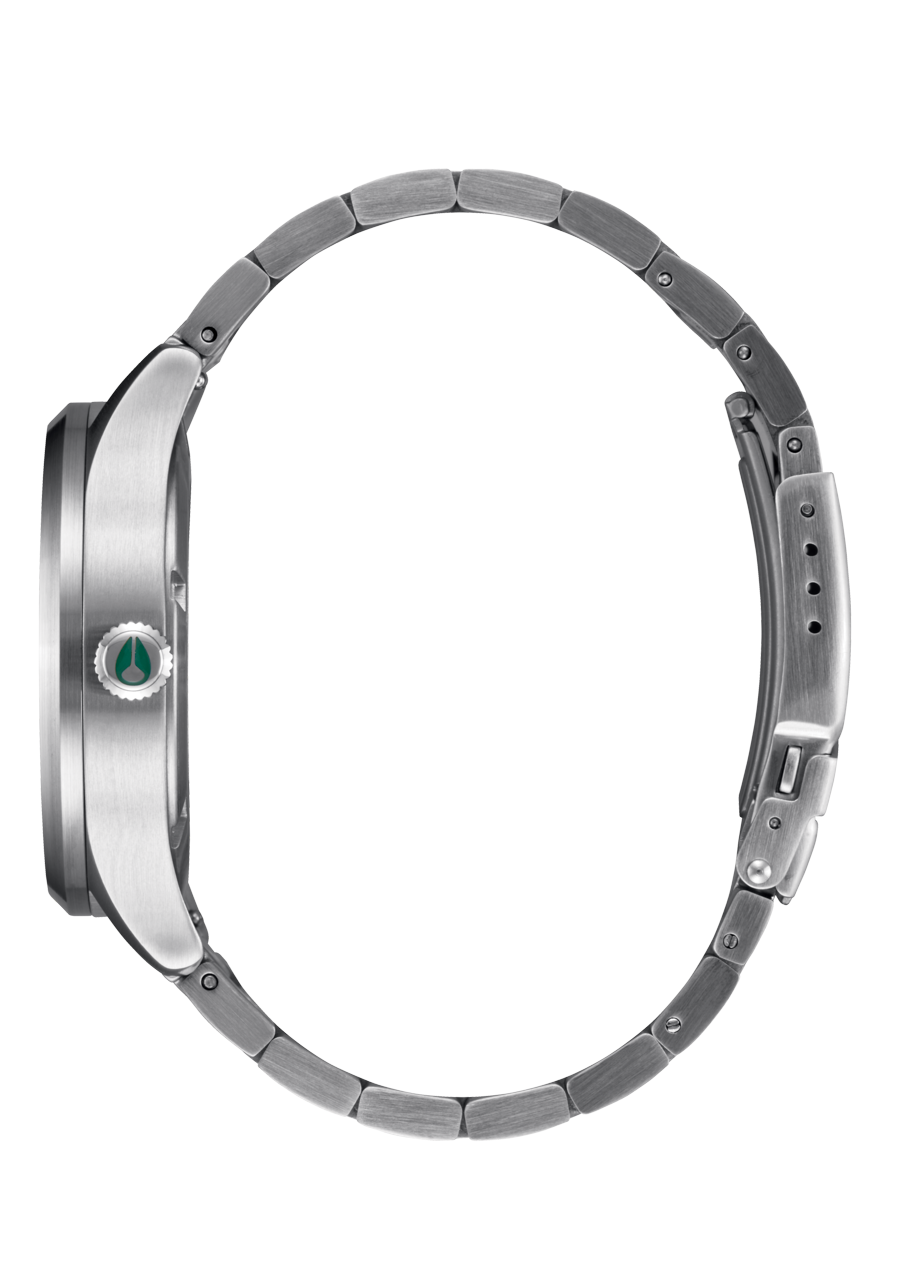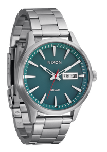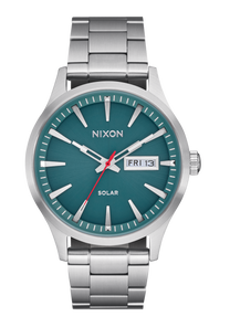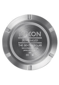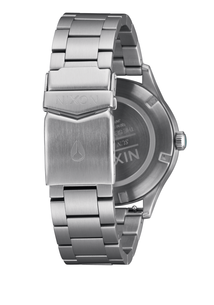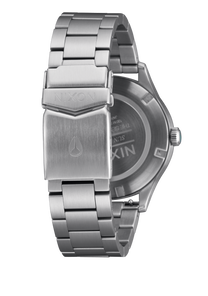 Semi-transparent dial features applied stainless steel stick indices, Nixon wordmark and date window. It also comes with an up-printed seconds track and custom lume-tipped steel skeleton hands.