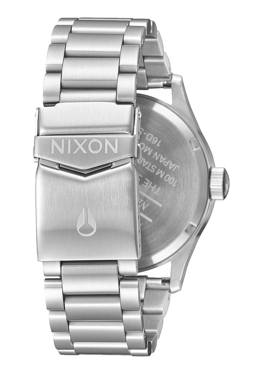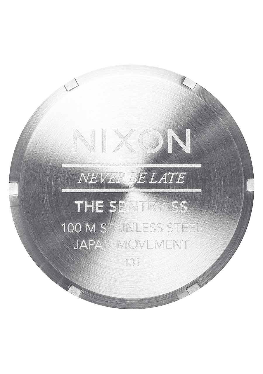 The Nixon Sentry Stainless Steel watch uses a Japanese Miyota 2305 quartz 3-hand movement and features a bilingual day and date function in English and Spanish.
