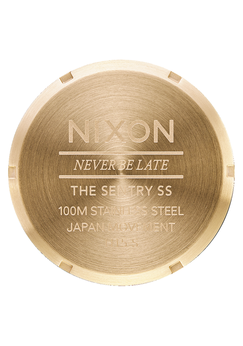 The Nixon Sentry Stainless Steel watch uses a Japanese Miyota 2305 quartz 3-hand movement and features a bilingual day and date function in English and Spanish.