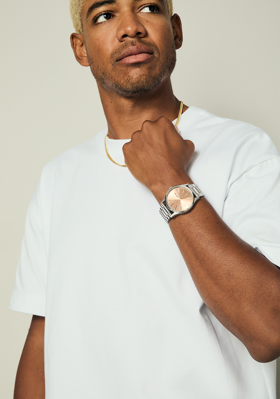 The Sentry is an elegant timepiece with an adventurous side. Think black tie meets block party. The face pops with depth and detail, but the solid stainless steel case, hardened mineral crystal, and waterproof rating of 100m, you don't have to worry about it not being able to hang in the real world.