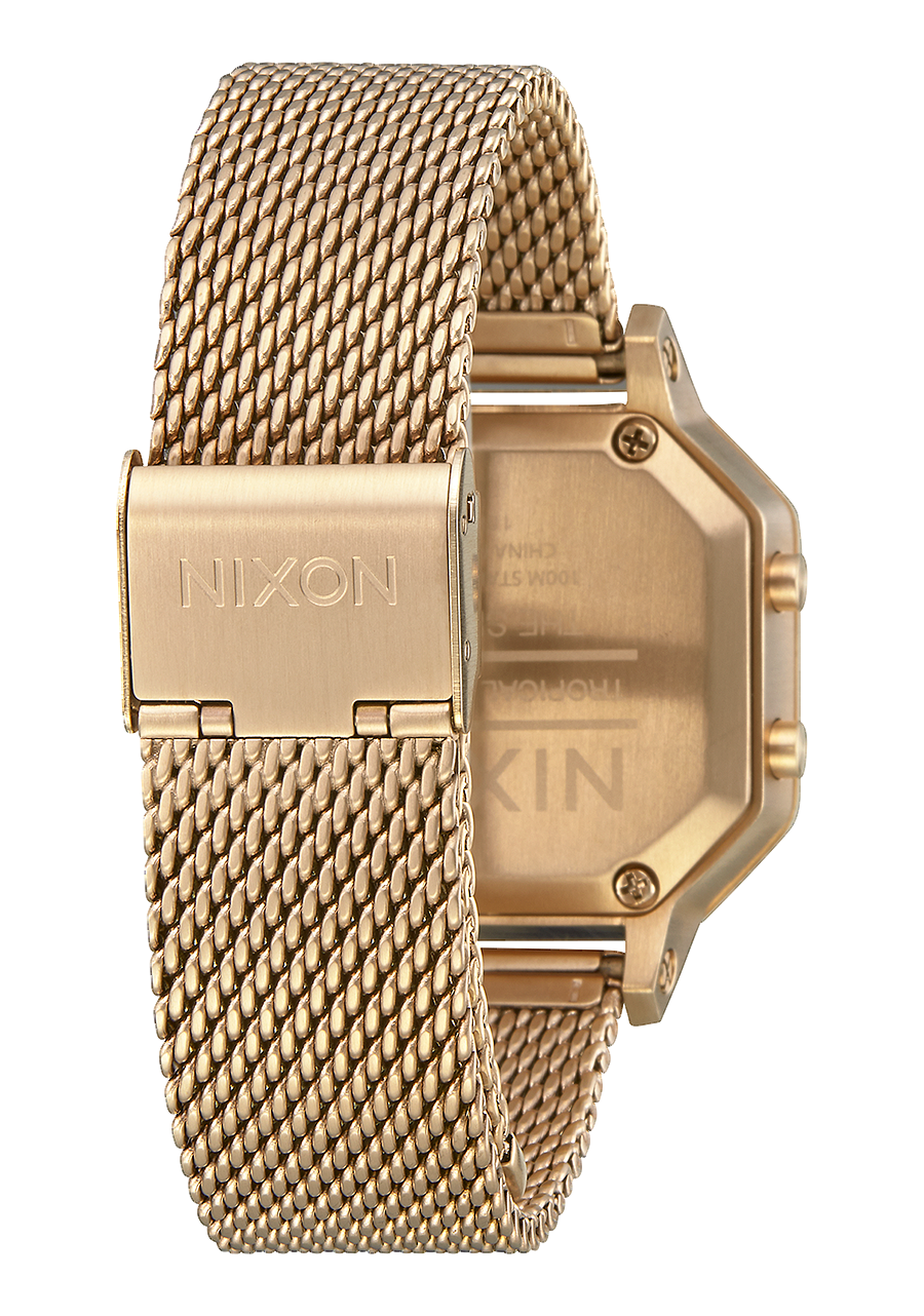 The Siren Milanese watch features a stainless steel case and an 18mm custom stainless steel Milanese bracelet with a stainless steel sliding adjustment buckle and screw-bars. To adjust the Milanese bracelet for a secure fit, you can use the sliding adjustment buckle to tighten or loosen the band. This involves sliding the buckle along the band to the desired position. A tool to begin this adjustment is included in the watch box. For more information visit the Nixon blog.