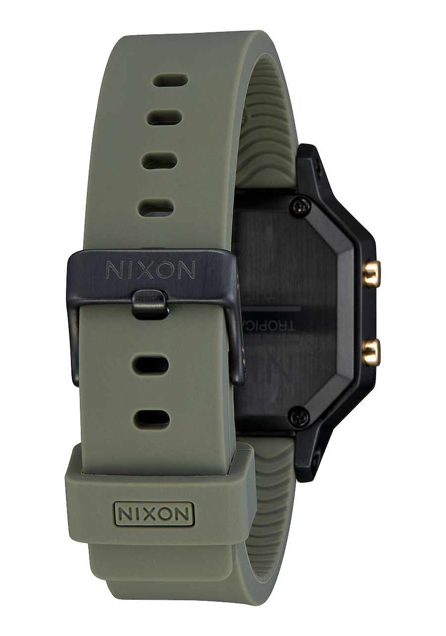 The Nixon Siren Stainless Steel uses a custom stainless steel case with stainless steel screw bars and pushers, and a custom injection molded ultra-soft silicone band with a solid stainless steel buckle and screw bars. The watch is water resistant up to 100 meters / 10 ATM, making it highly durable for water and sports use.
