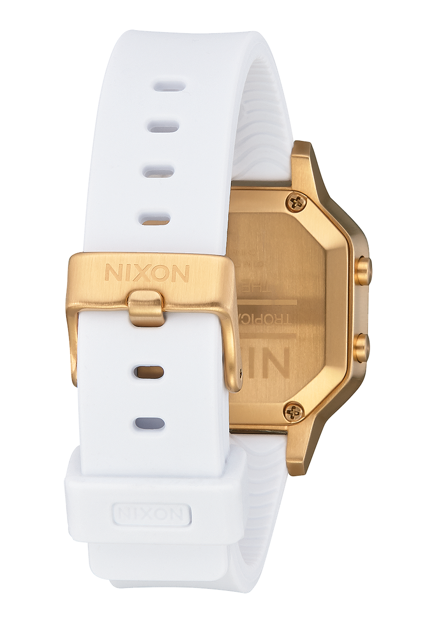 The Nixon Siren Stainless Steel uses a custom stainless steel case with stainless steel screw bars and pushers, and a custom injection molded ultra-soft silicone band with a solid stainless steel buckle and screw bars. The watch is water resistant up to 100 meters / 10 ATM, making it highly durable for water and sports use.