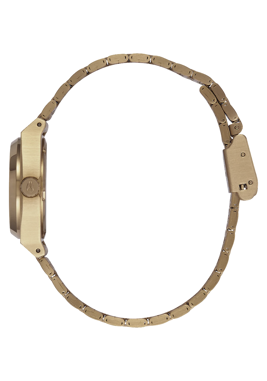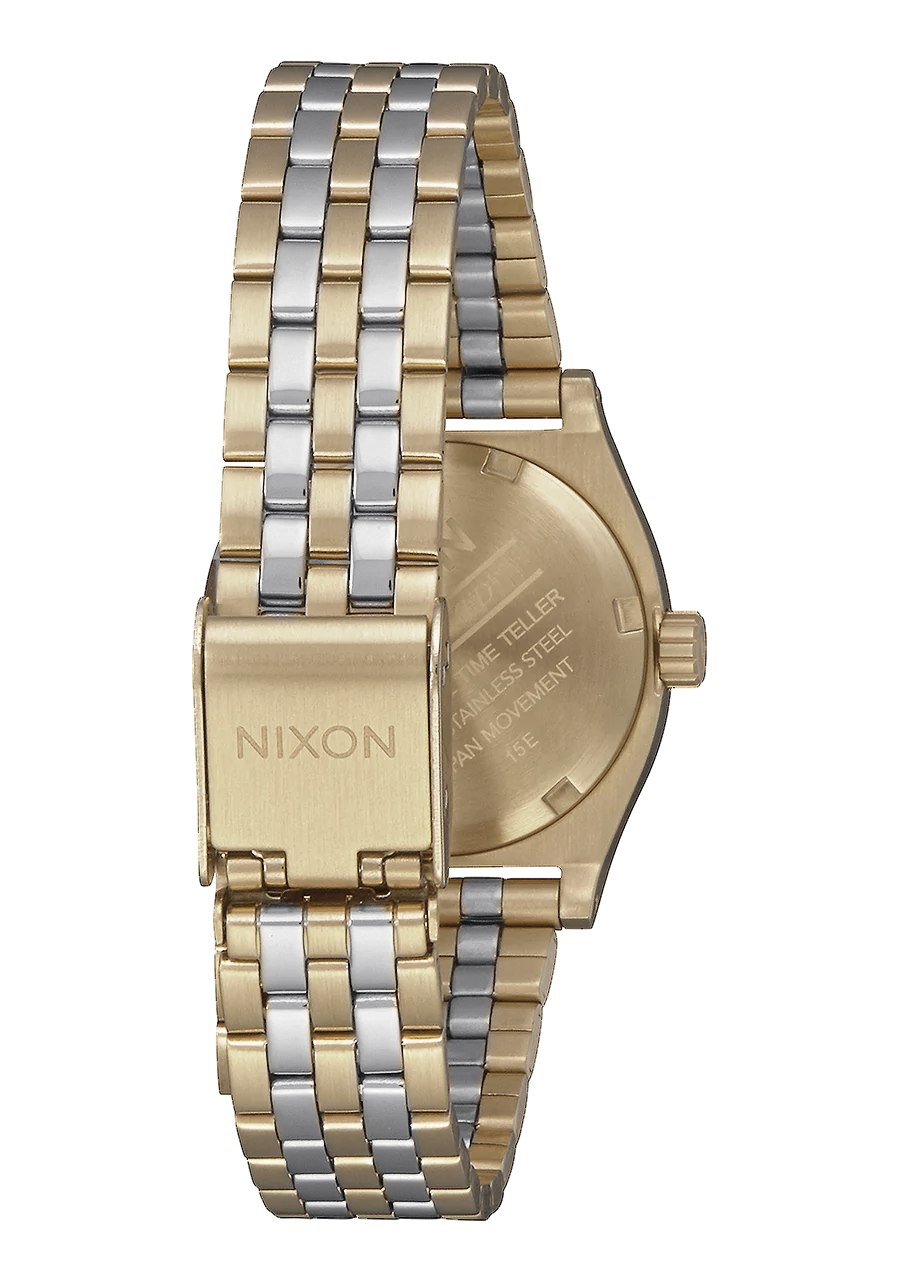 The Nixon Small Time Teller watch is water resistant with a rating of 100 meters / 10 ATM, making it suitable for activities like swimming and showering.