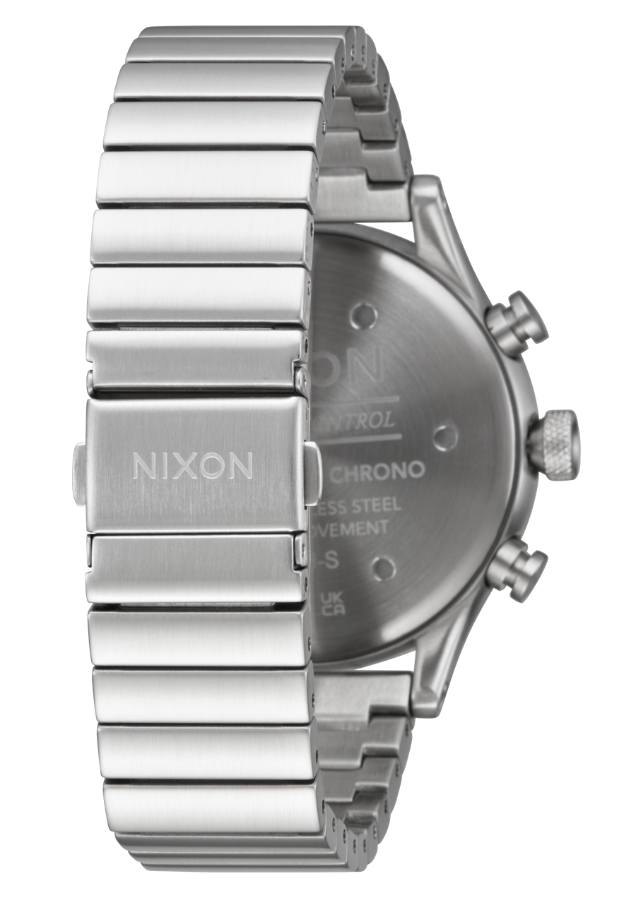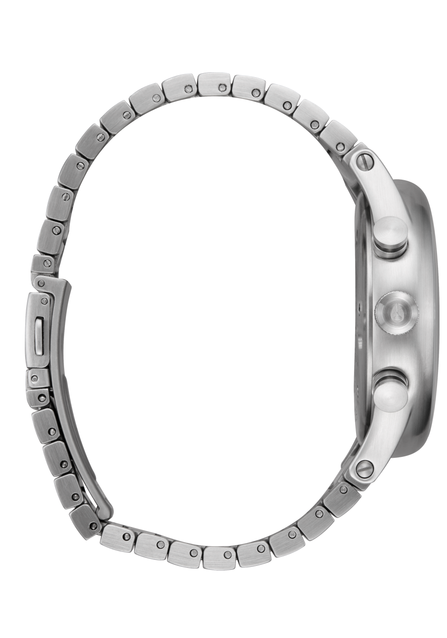 The Station Chrono upcycles classic design with organic detail. Numerals have been replaced with textured subdials, long indices, and bent minute and second hands.