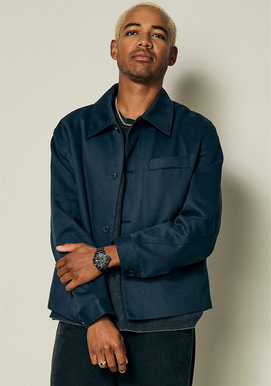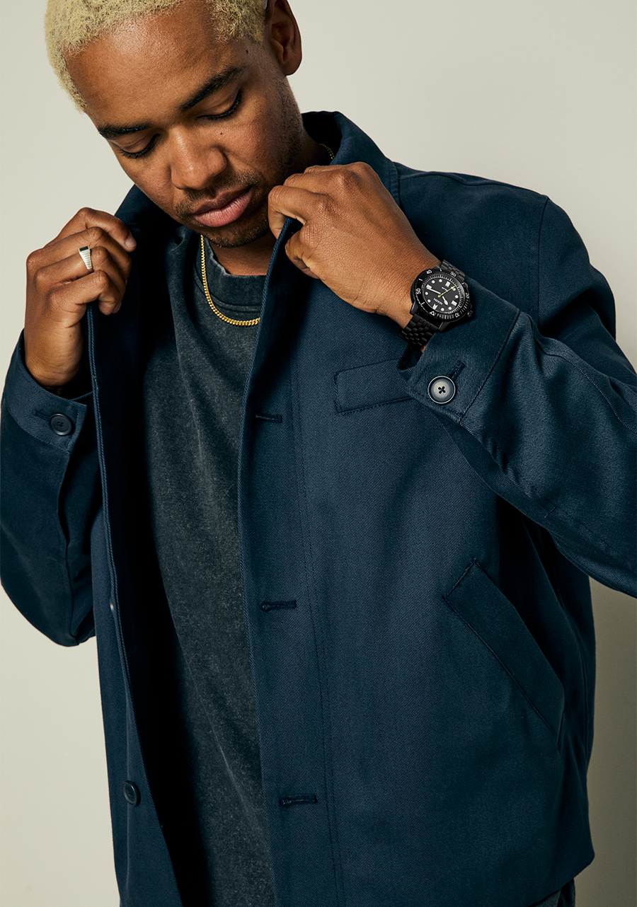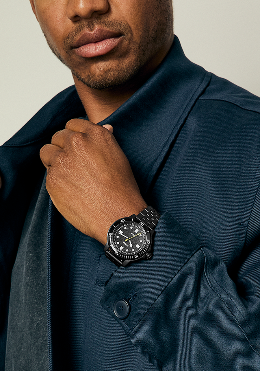 Dial is surrounded by a custom dial ring with a printed seconds track, bold applied indices and custom molded hands. Lume is applied to the indices and watch hands.