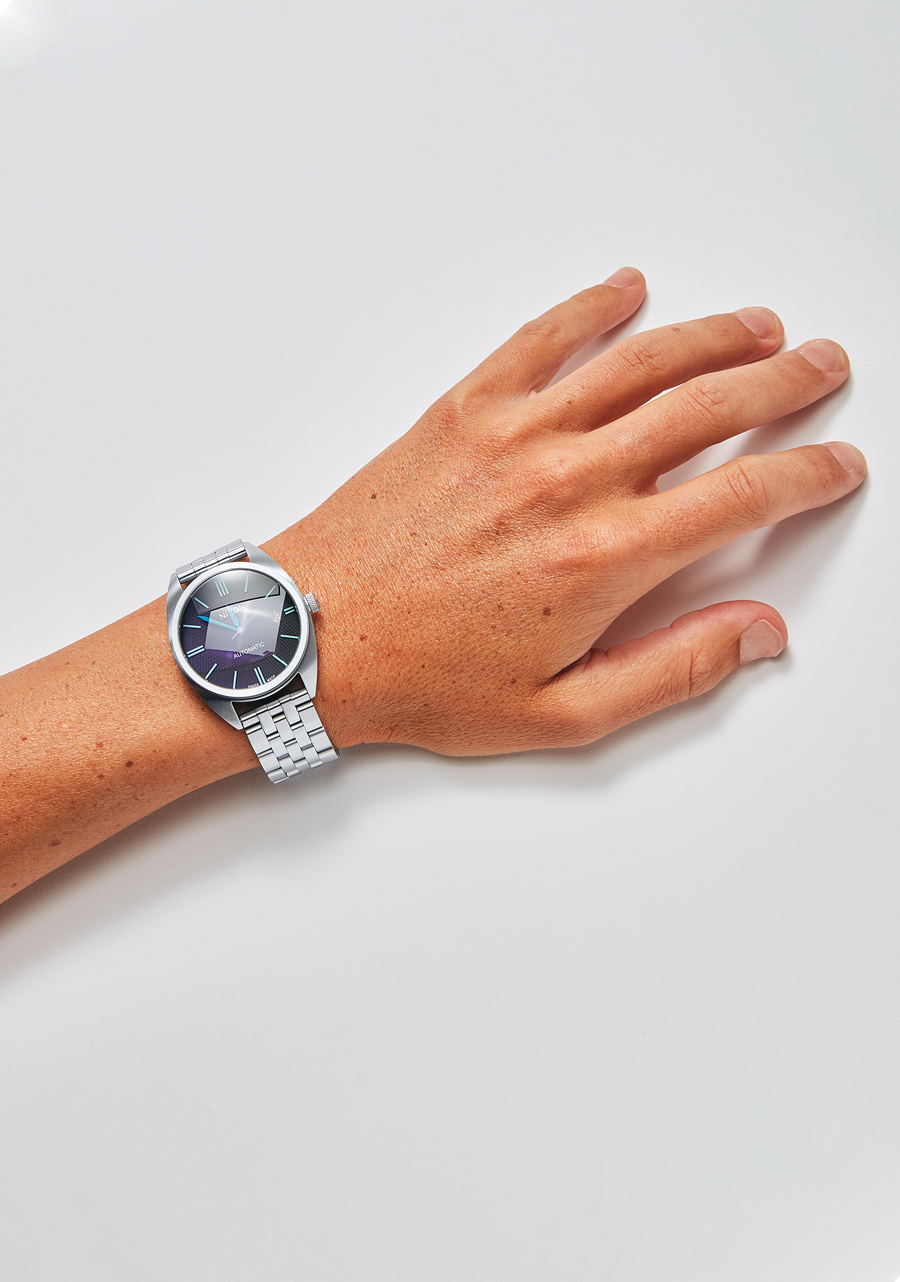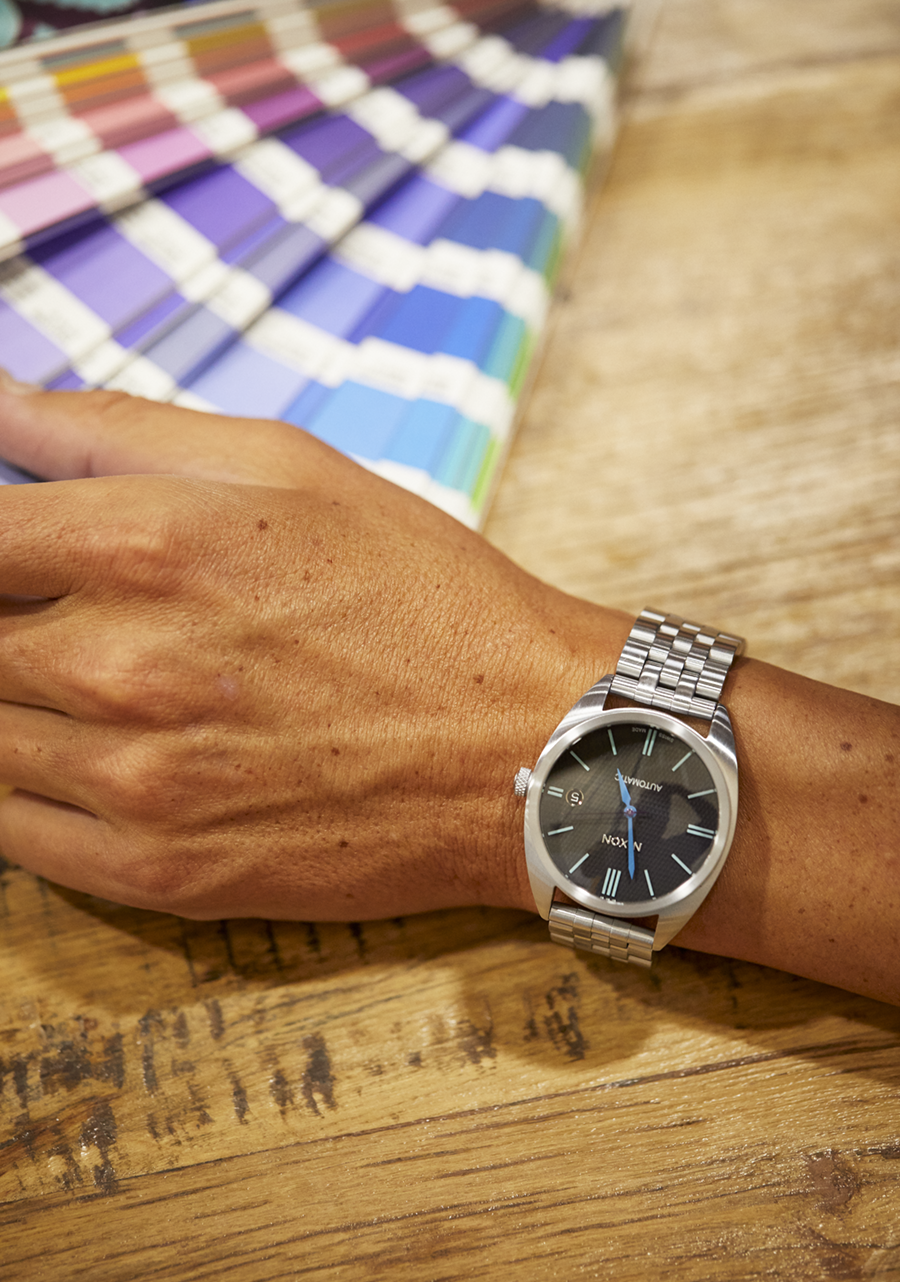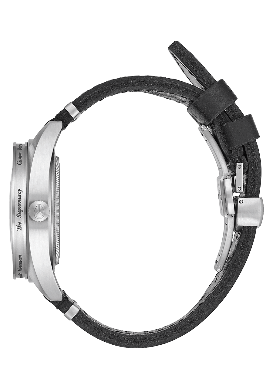 The Nixon Supremacy case is made from custom solid stainless steel. Both a stainless steel bracelet and a Horween leather strap are included.