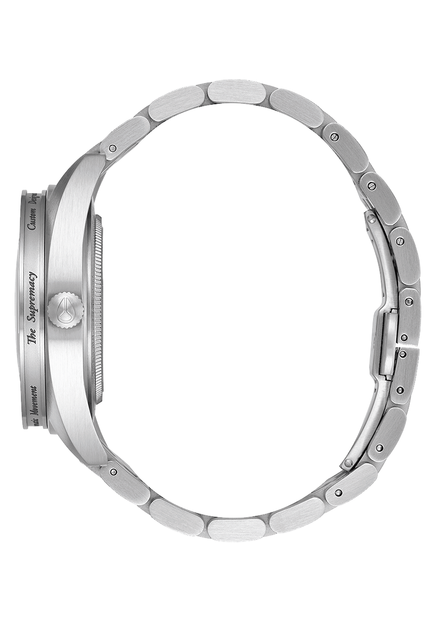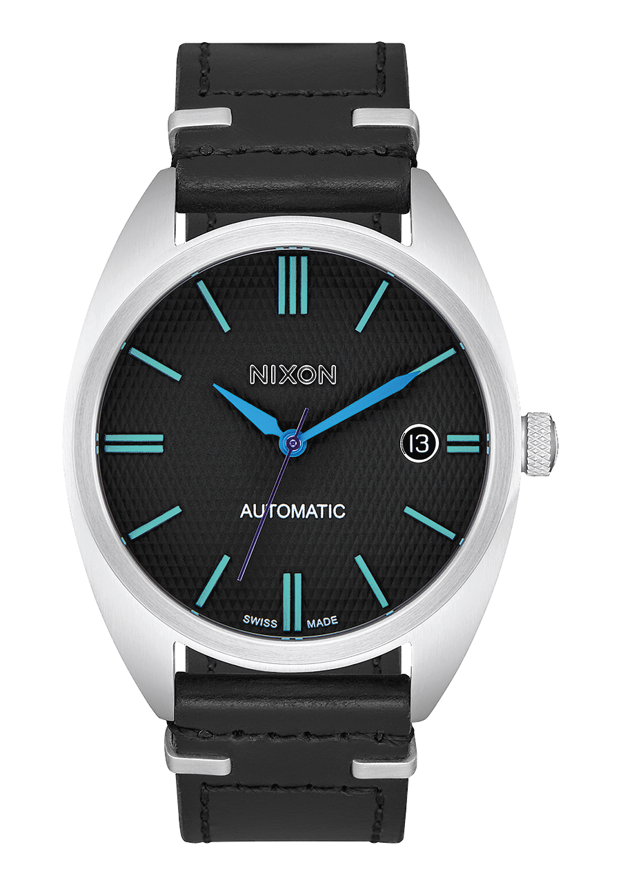 The Nixon Supremacy features a 40mm stainless steel case with a sapphire crystal, offering 100 meters of water resistance. It includes a Swiss-made automatic movement with a date display at the 3 o'clock position, available with various strap options such as leather or a 5-link steel bracelet.