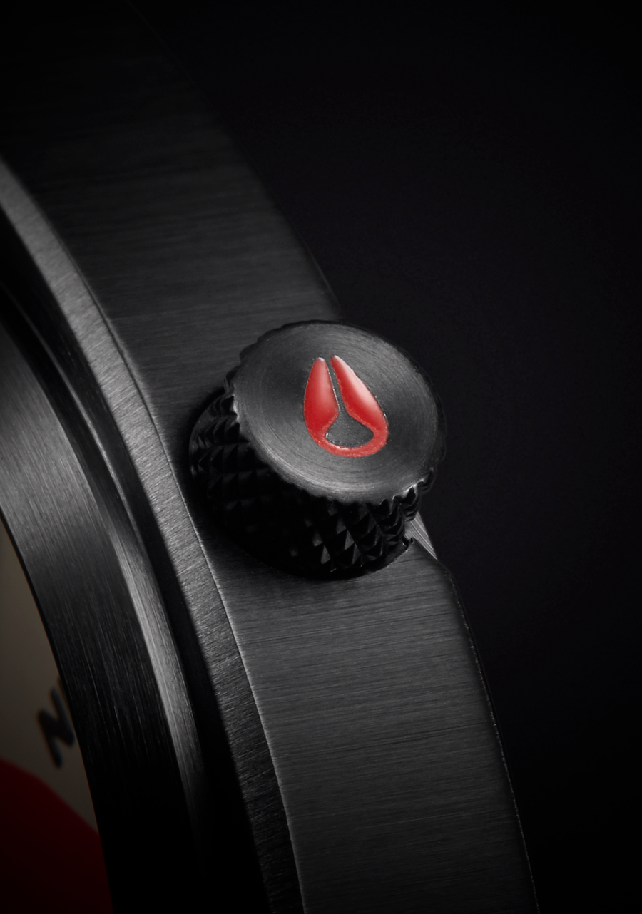 37mm custom solid stainless steel case with a 100 meter / 10 ATM water rating. Comes with a solid stainless steel fixed bezel, hardened mineral crystal, triple gasket stainless steel crown and stainless steel screw down caseback.